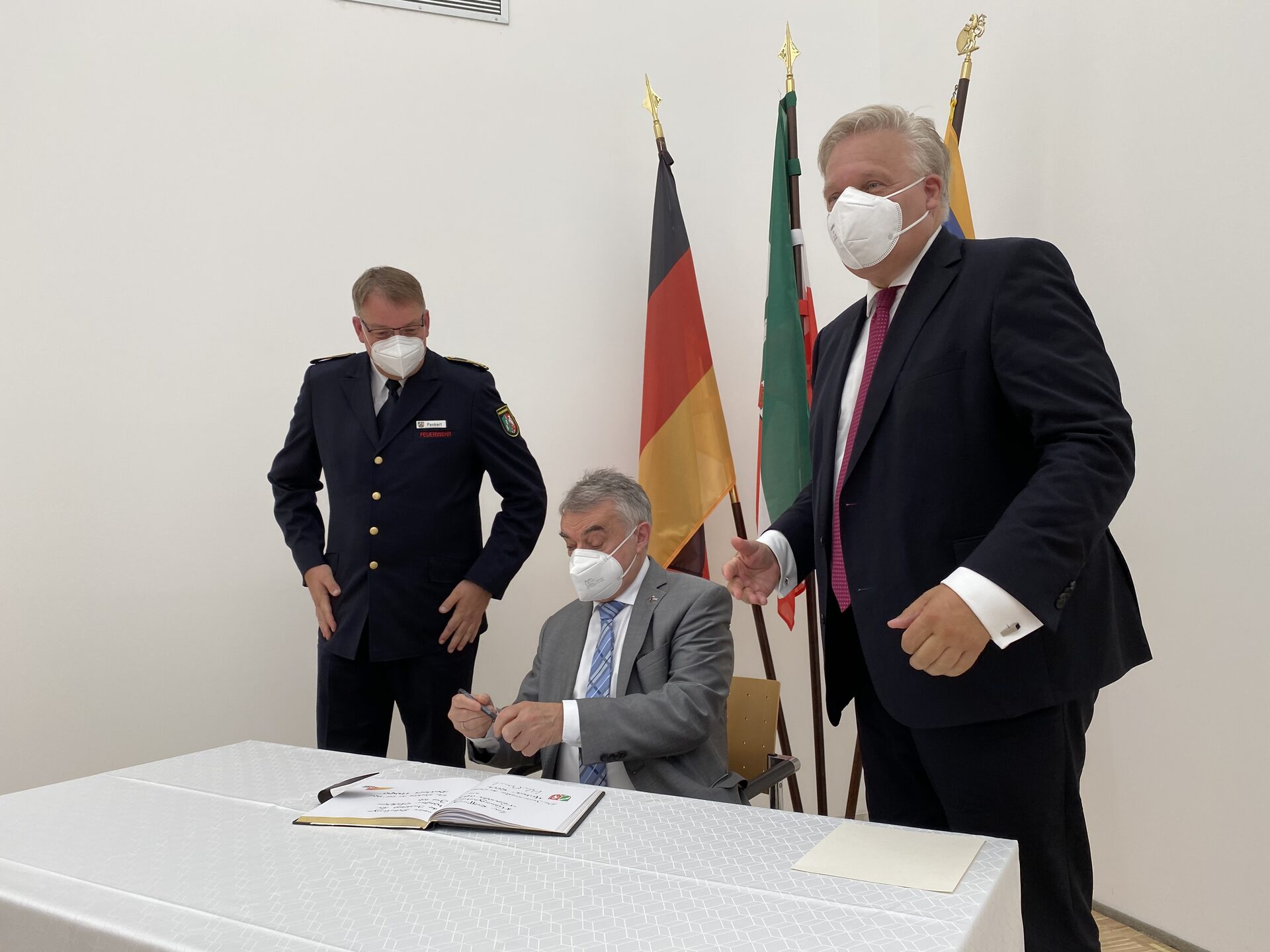 Berthold Penkert, Direktor des IdF und Minister Herbert Reul tragen sich im Beisein von Landrat Wolfgang Spelthahn ins Goldene Buch des Kreises Düren ein.