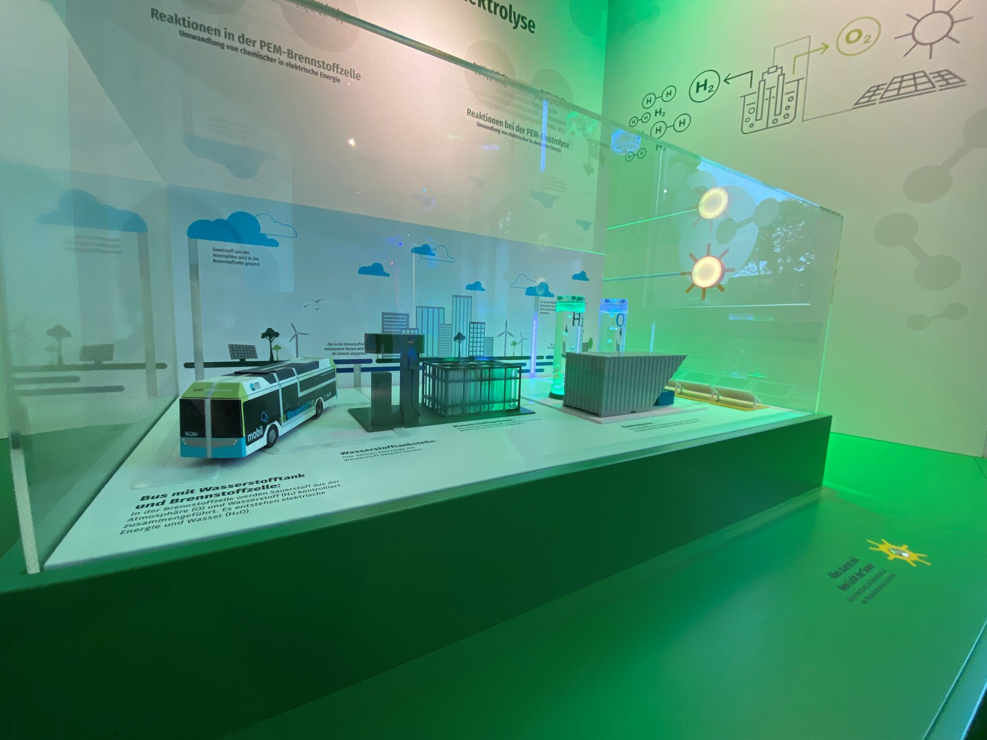 Woher kommt Wasserstoff? Wie wird er genutzt? Welche Rolle spielt er für den Kreis Düren? Wie und wo wird H2 in Zukunft im Kreis Düren hergestellt und wo kommt er zum Einsatz? Diese und weitere Fragen werden auf rund 100 Quadratmetern und in vier großen Stationen ausführlich und kurzweilig beantwortet. Sie spannen den Bogen von der Entstehung des H2 bis zur Anwendung.