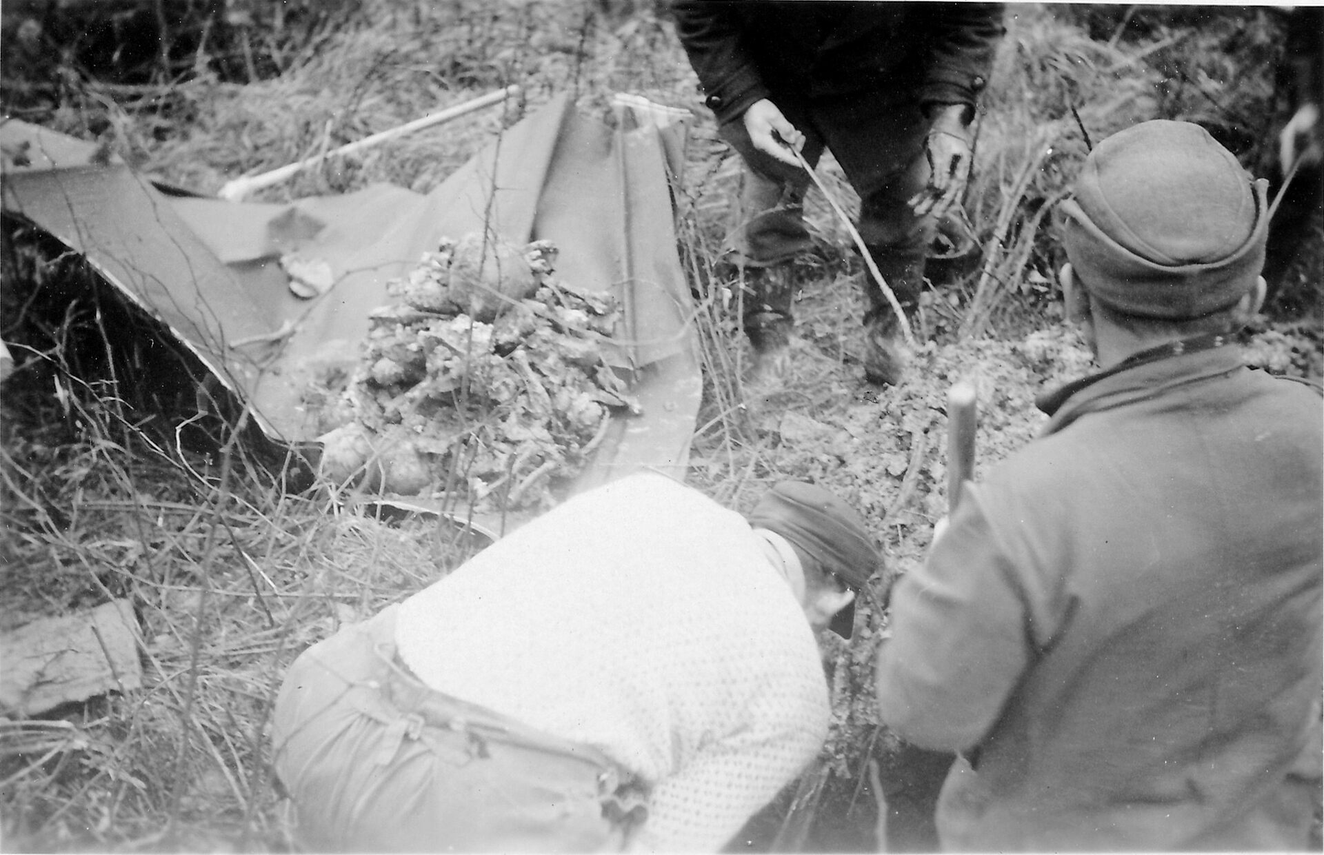 Die drei Fotos dokumentiert eine Umbettungsaktion aus Raffelsbrand. Aus dem Grab konnten die Überreste von sechs Toten geborgen und auf die Kriegsgräberstätte Hürtgen überführt werden. Das Datum der Aufnahmen ist nicht bekannt.