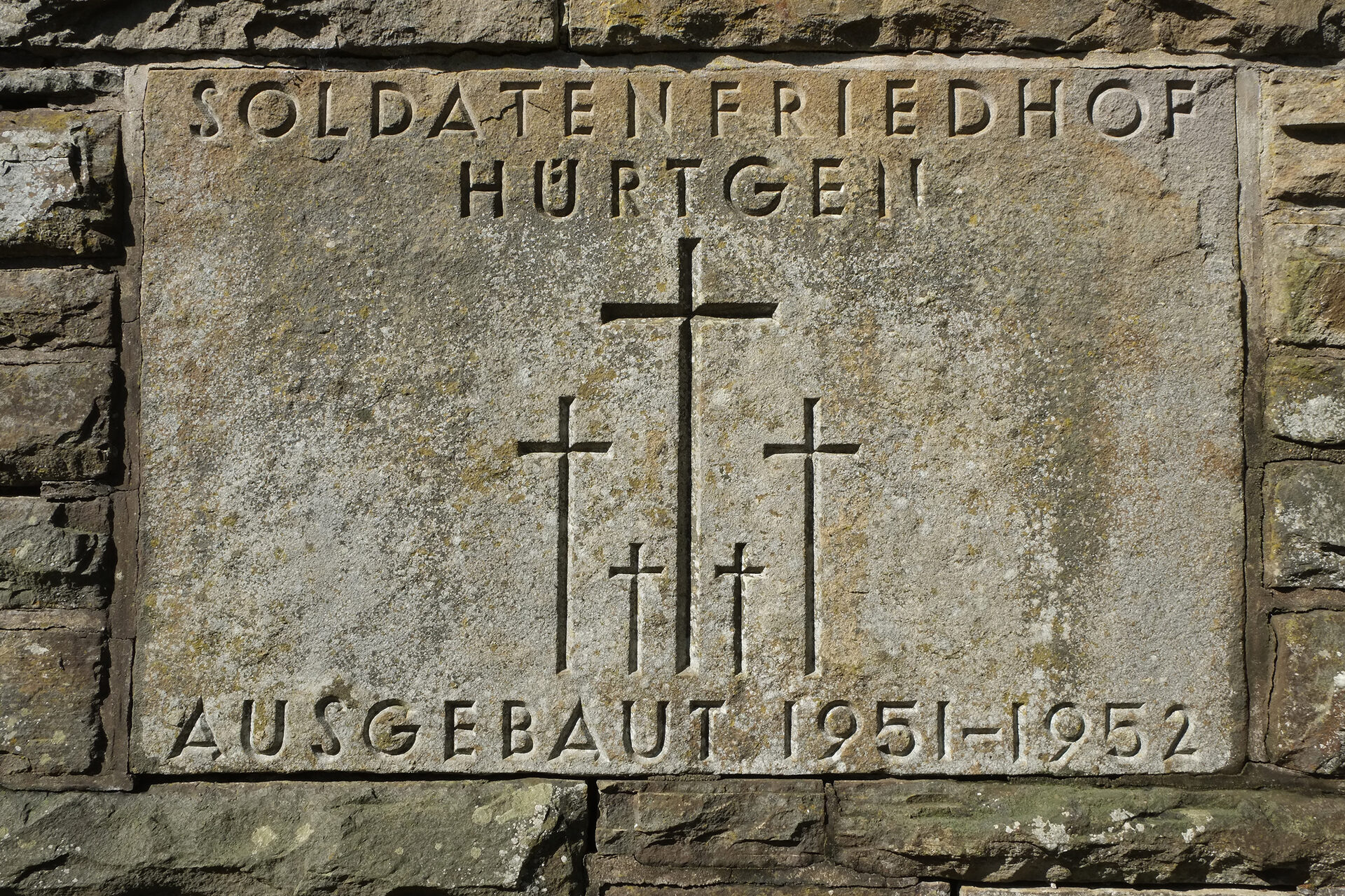 Nähert man sich der Anlage vom Parkplatz aus, dann fällt direkt am Treppenaufgang eine Tafel aus der Entstehungszeit der Kriegsgräberstätte ins Auge. Die fünf symbolisch angeordneten Kreuze stellen das Signet des Volksbunds Deutsche Kriegsgräberfürsorge dar. Es wurde von dem Berliner Grafiker Ernst Böhm (1890-1963) in den 1920er-Jahren entworfen.