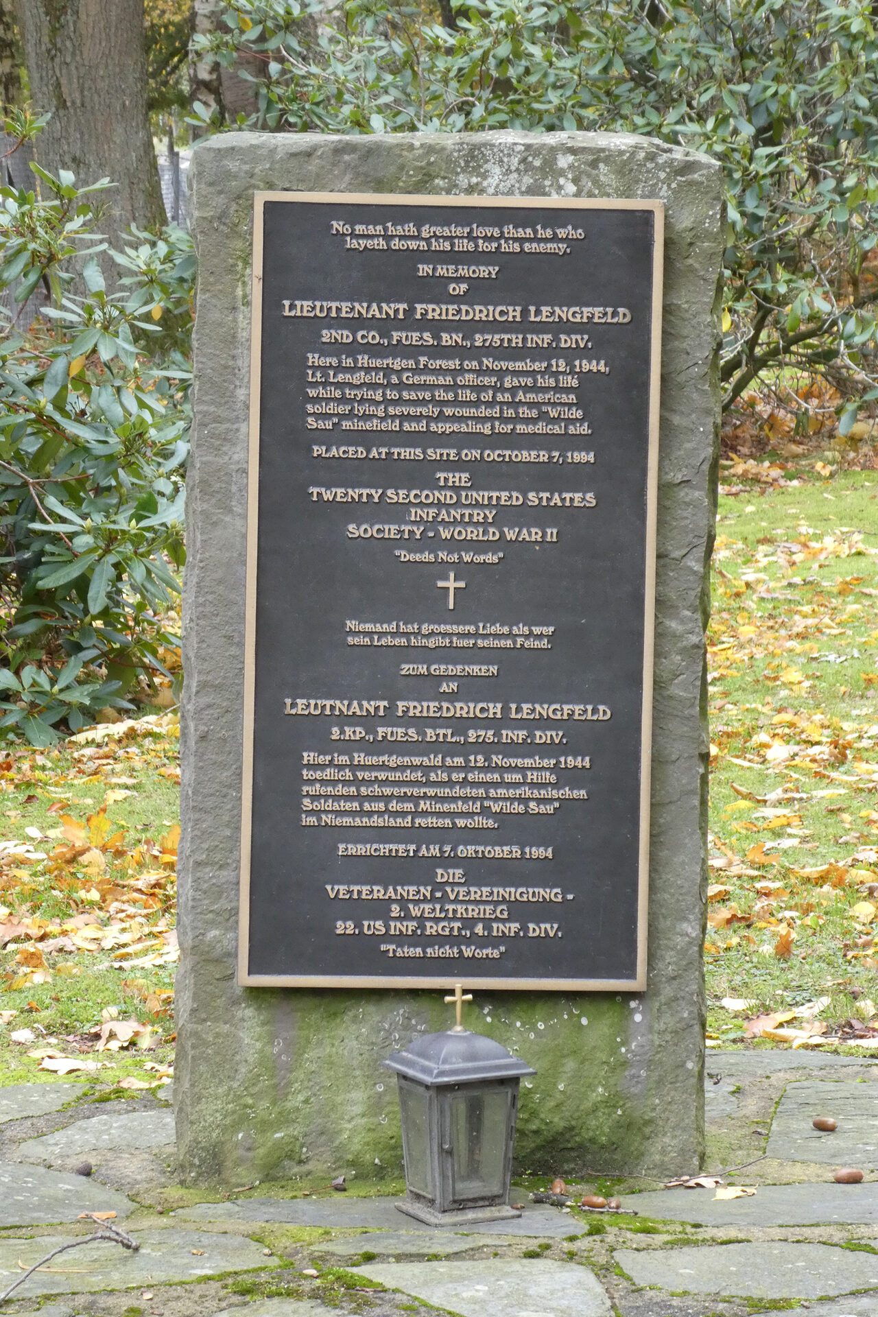 Friedrich Lengfeld war während des Krieges an der Ostfront im Einsatz und im Spätherbst 1944 an den Kämpfen im Hürtgenwald beteiligt. Er starb am 12. November 1944, nachdem er an der Spitze eines Bergungstrupps versucht hatte, einen um Hilfe rufenden amerikanischen Soldaten aus dem Minenfeld „Wilde Sau“ zu retten. Lengfeld wurde dabei selbst Opfer einer deutschen Schützenmine. 1994 beantragte die Veteranenvereinigung „Förder- und Freundeskreis Hubertuskreuz Linnich“, eine Gedenktafel zur Erinnerung an Lengfeld auf der Kriegsgräberstätte anbringen zu lassen. Vorangetrieben wurde die Initiative von Hubert Gees, einem früheren Meldegänger Lengfelds. Nach dessen Angaben kam die Idee zu der Tafel von einem amerikanischen Veteranen. Am 7. Oktober 1994 wurde die in den USA gefertigte Bronzetafel aus Anlass des 50. Jahrestages der Landung der Alliierten in der Normandie installiert.