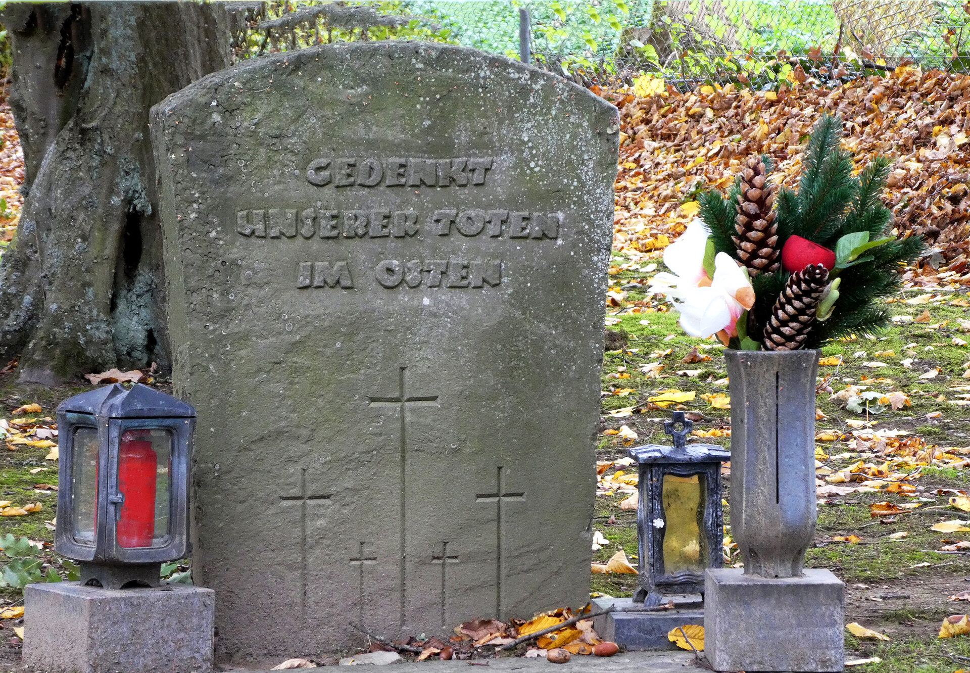 Den Stein mit der Inschrift „Gedenkt unserer Toten im Osten“ ließ der Volksbund 1959 aufstellen, nicht allein auf der Kriegsgräberstätte Hürtgen, sondern auch auf vielen anderen Kriegsgräberstätten. Er sollte, nachdem die Ost-West-Teilung endgültig schien, denjenigen Familien einen Ort für ihre Trauer geben, deren Angehörige jenseits des „Eisernen Vorhangs“ begraben worden waren. Die Inschrift des Steins ist ein typisches Beispiel für die Gedenkrhetorik in Zeiten des Kalten Krieges.