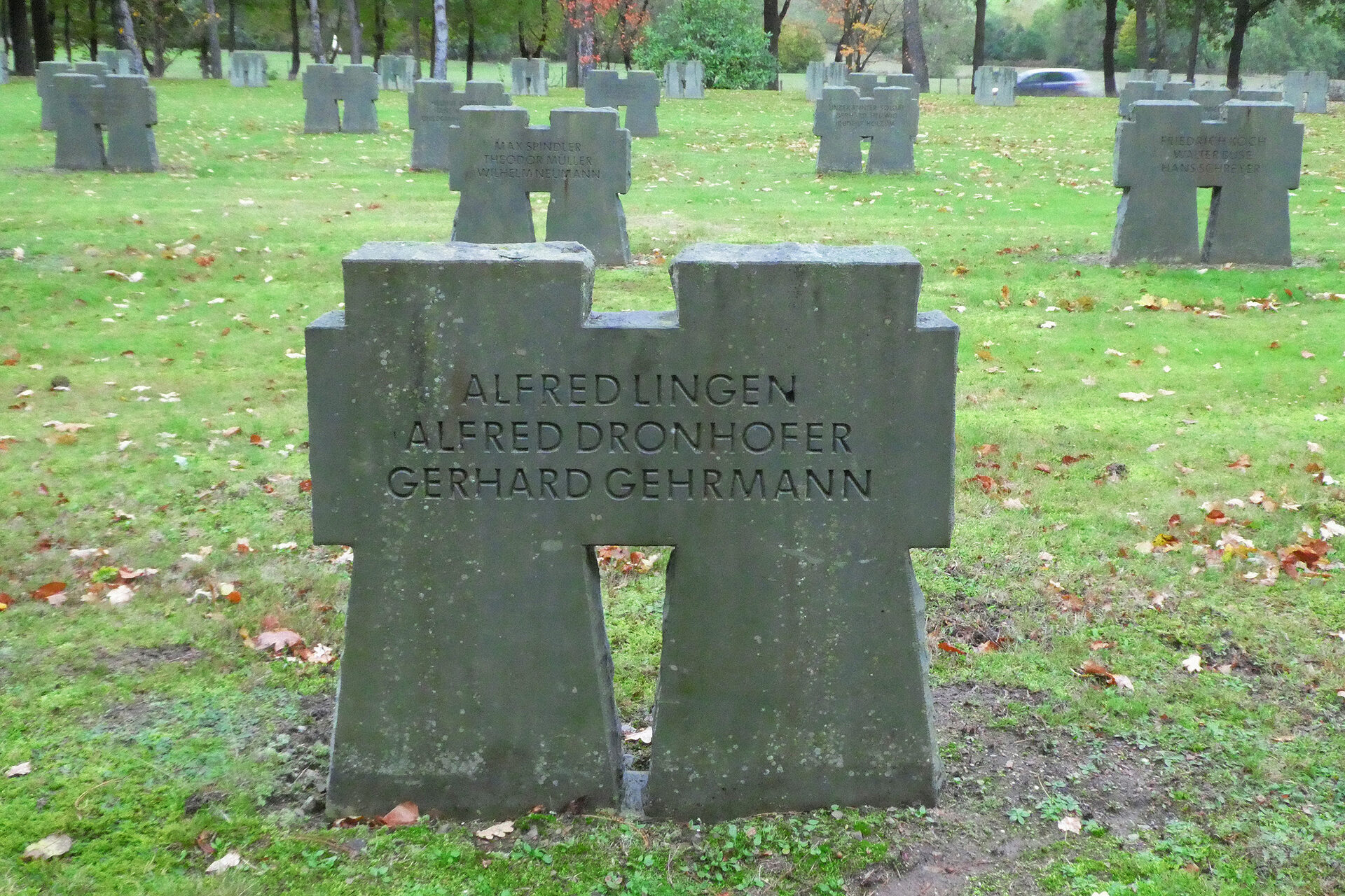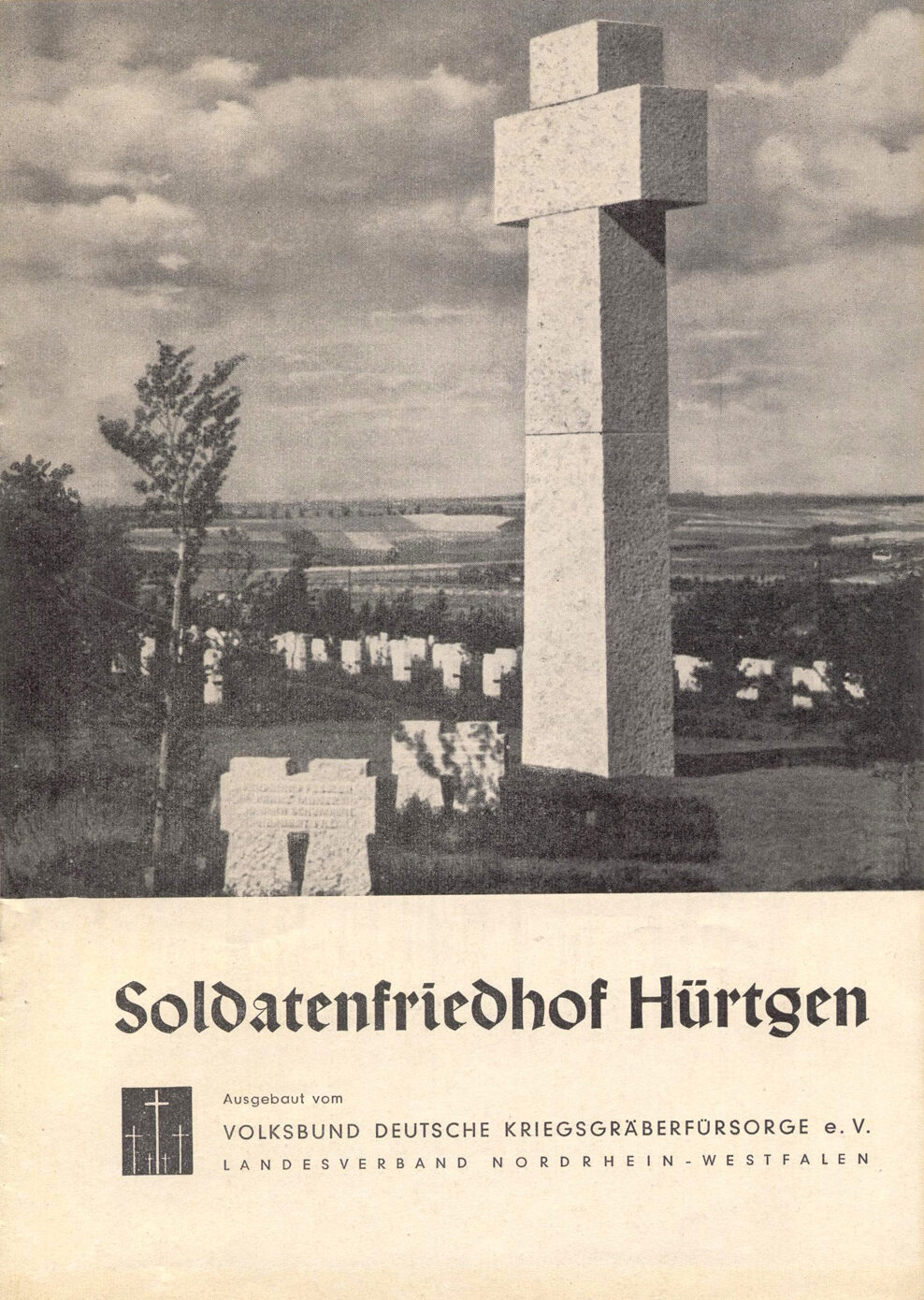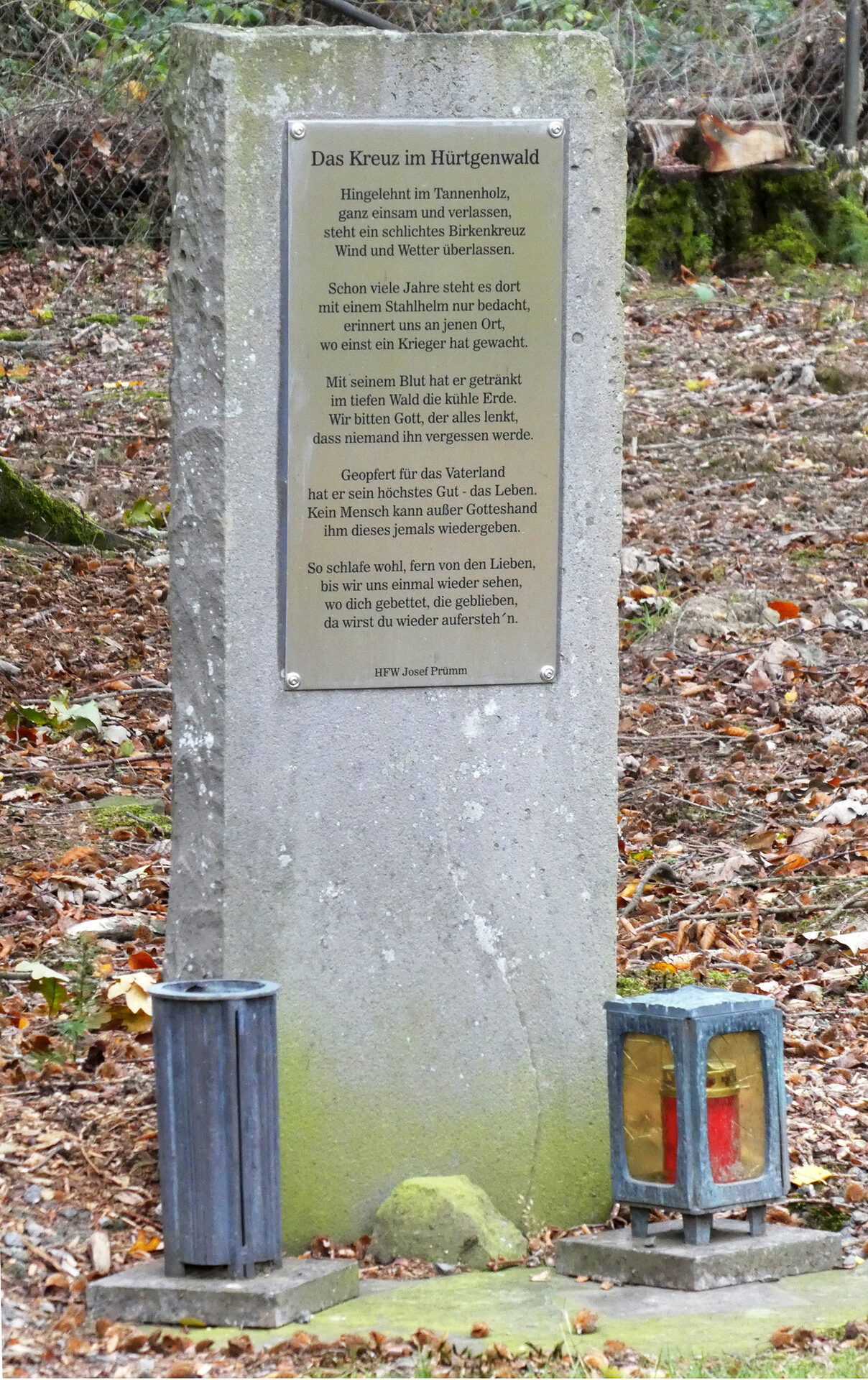 Hauptfeldwebel Josef Prümm aus Eilendorf sandte 1971 das von ihm verfasste Gedicht „Das Kreuz im Hürtgenwald“ an den Volksbund Deutsche Kriegsgräberfürsorge. Unproblematisch ist der Text nicht, weil es den Kriegstod zum „Opfer für das Vaterland“ verklärt. Der Volksbund sah auch von einer weiteren Nutzung des Gedichtes ab. 1999 ließ der Friedhofswärter es in eine Metallplatte gravieren, auf einem ehemaligen Treppenstein befestigen und am äußersten Rand der Kriegsgräberstätte aufstellen.