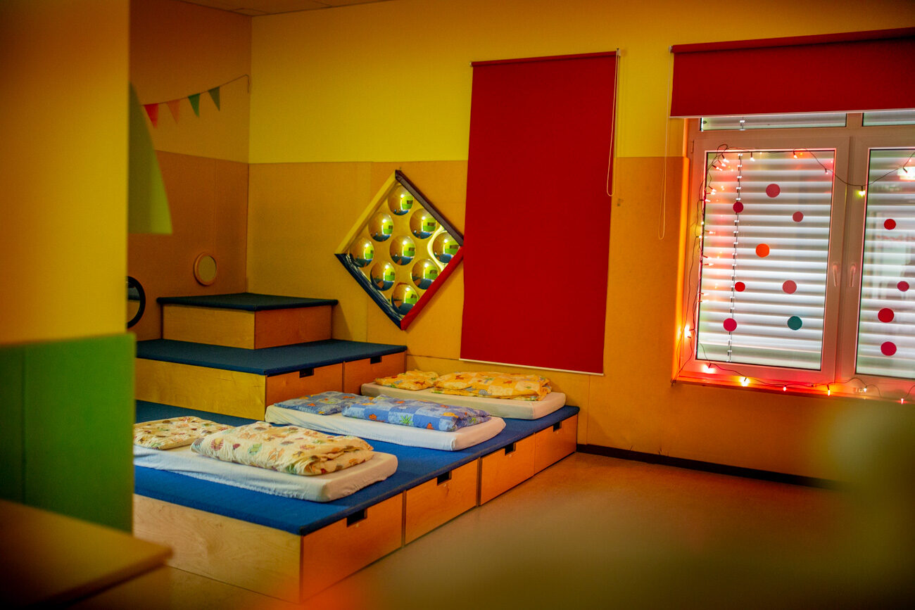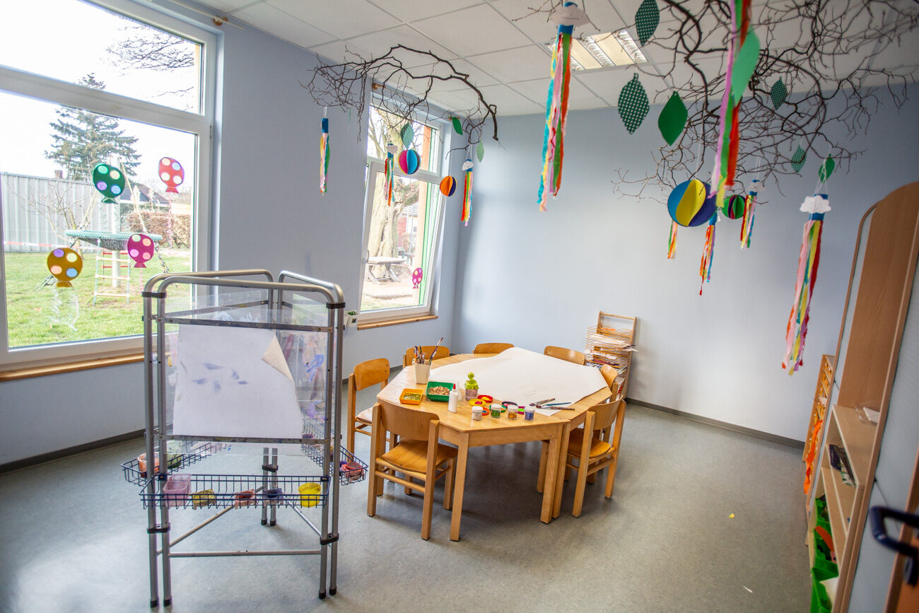 Unsere Kita liegt in einem kleinen, ländlichen Ort umgeben von Feldern und Wiesen mit verschiedenen Tieren ( Pferden, Schafen, Hühnern). Die Einrichtung ist ein moderner, farbenfroher Bau mit großen Fenstern und Bullaugen. Die Innengestaltung ist ebenfalls farbenfroh, sehr geräumig und einladend. Zu den vier Gruppenräumen gehören noch jeweils ein Nebenraum, ein Waschraum, Toiletten und ein Wickelraum. Die beiden großzügigen Eingangshallen dienen als Erlebnis- und Entdeckungshallen und laden zur Bewegung, Kommunikation und Kontaktaufnahme ein. Zudem verfügt unsere Einrichtung über einen Sprachraum und einen langen Flur, der als Bewegungsbaustelle dient und täglich genutzt werden kann. Weitere Räume sind eine große Turnhalle mit angrenzendem Materialraum , eine Küche mit zwei danebenliegenden Essräumen, ein Besprechungszimmer, ein Personalraum, ein Büro und verschiedene Räume zur Aufbewahrung von Spiel- und Bastelmaterialien und zwei Hauswirtschaftsräume.
