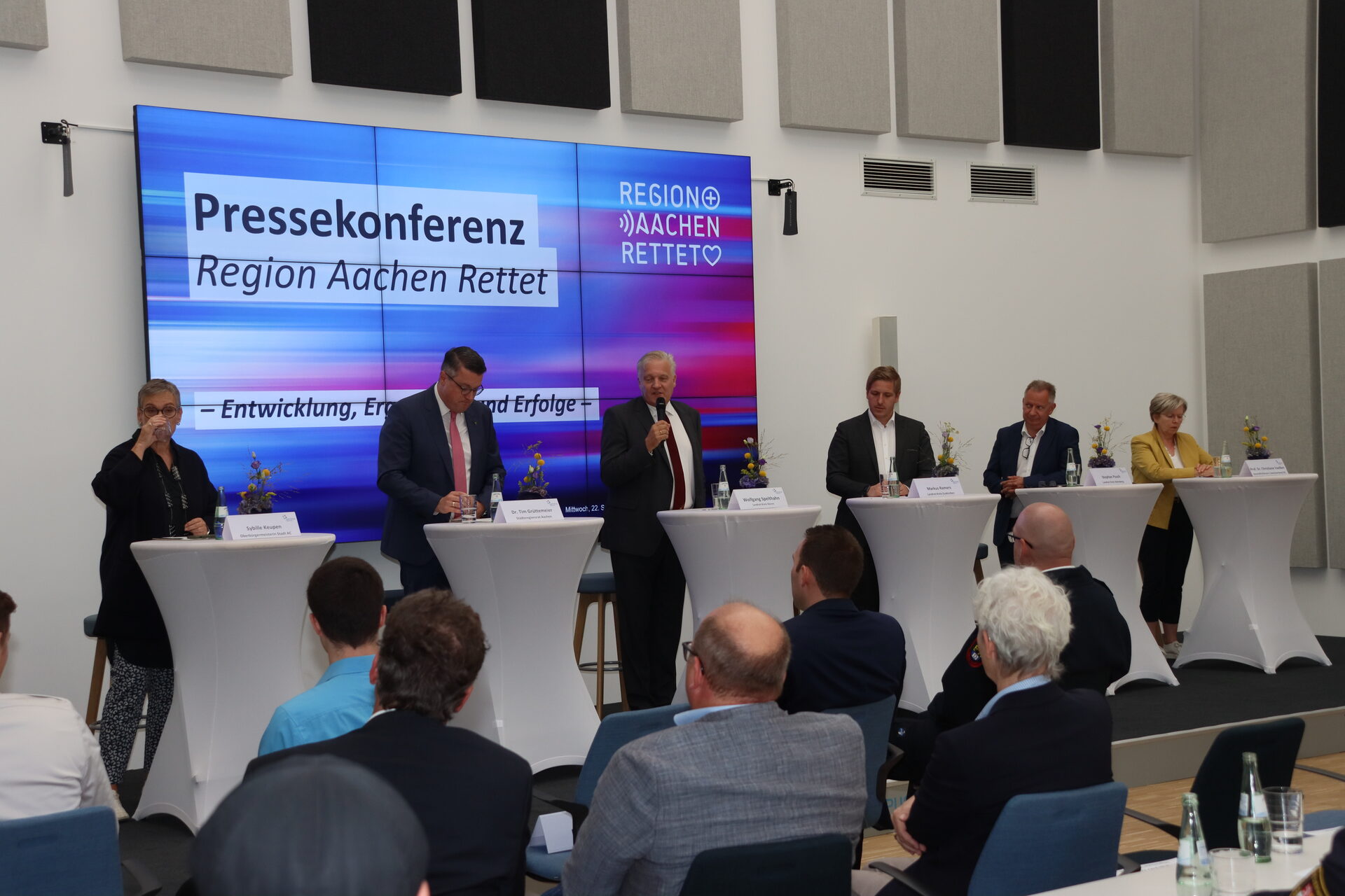 Zusammen mit den Landräten Markus Ramers (Kreis Euskirchen) und Stephan Pusch (Kreis Heinsberg) sowie Sibylle Keupen (Oberbürgermeisterin der Stadt Aachen), Dr. Tim Grüttemeier (Städteregionsrat) und Prof. Dr. Christiane Vaeßen (Geschäftsführerin der Region Aachen) betonte Landrat des Kreises Düren Wolfgang Spelthahn den gemeinsamen Erfolg und die hervorragende regionsweite Unterstützung der Rettungsdienste durch die ehrenamtlichen Ersthelfer und Ersthelferinnen.