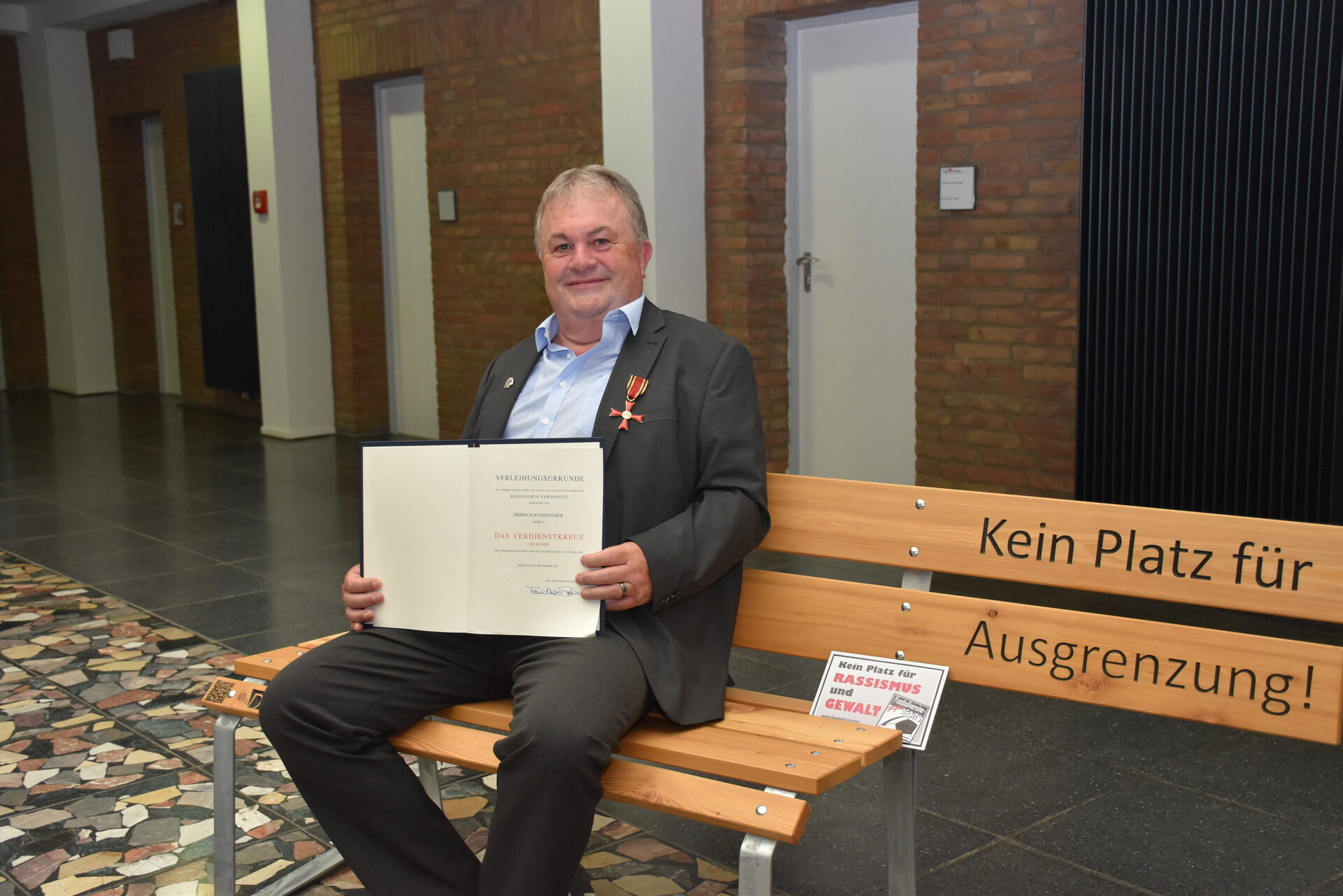 Entschlossen gegen Rassismus: Joachim Ecker trägt mit Stolz das Bundesverdienstkreuz und freut sich, dass sie Bänke gegen Ausgrenzung bald im ganzen Kreisgebiet stehen.