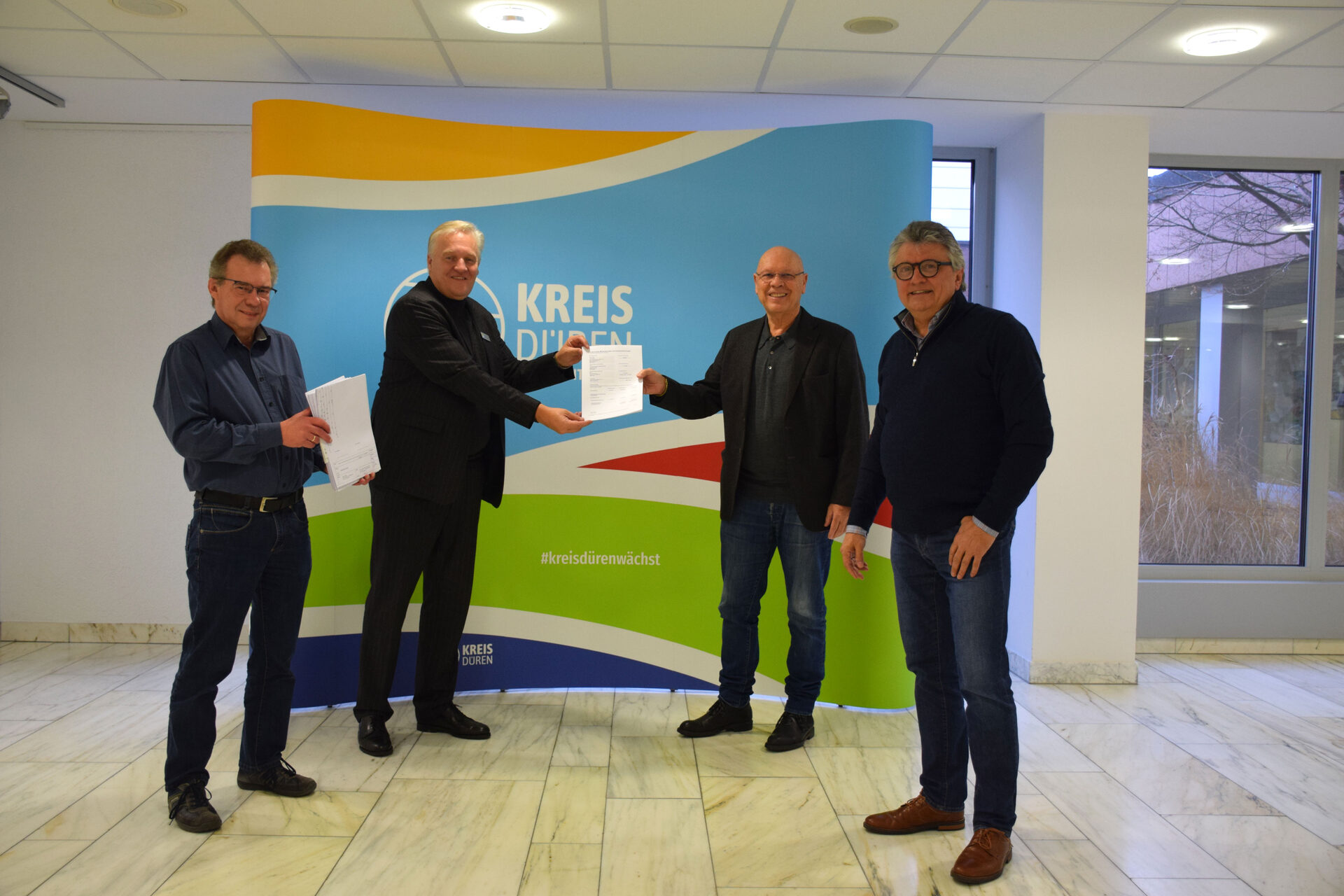 "Unserem Ziel, in den kommenden Jahren von 270.000 auf 300.000+ Einwohnerinnen und Einwohner zu wachsen, kommen wir durch dieses Projekt ein ganzes Stück näher", so Landrat Wolfgang Spelthahn. "Das ist ein total wichtiges Signal für den öffentlich geförderten Wohnraum und ein Zeichen dafür, dass wir daran arbeiten, eine Lücke zu schließen". Am Freitag (17. Dezember) übergab er den Förderbescheid über 6.103.036,78 Euro, den der Kreis bewilligt hatte, Wolfgang Bündgen und Dieter Breitenwischer von der Kölner ISMAR GmbH, die das Projekt ausführt und sich für den öffentlich geförderten Wohnraum einsetzt. Sie nahmen den Bescheid stellvertretend für die Investorenfamilie entgegen. "Wir möchten hier im Kreis Düren einiges bewegen", so Bündgen.