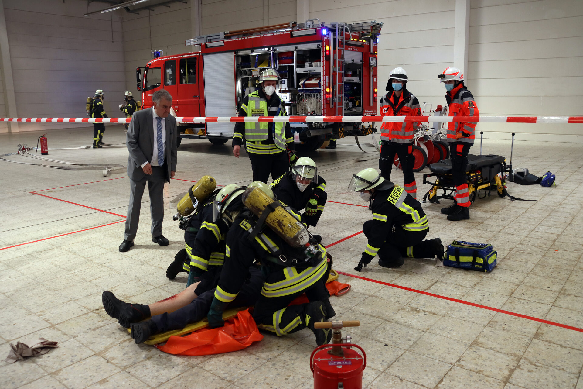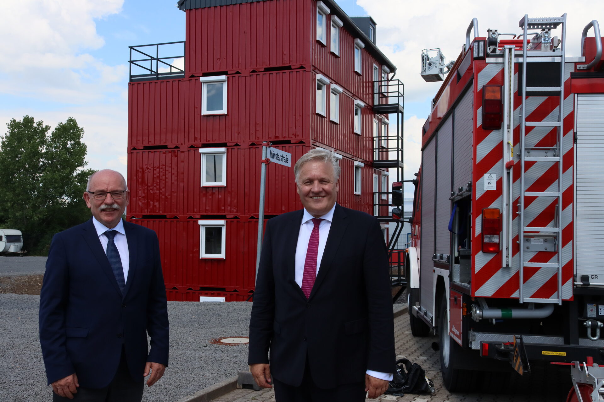 Dezernent Peter Kaptain und Landrat Wolfgang Spelthahn bei der Eröffnung des neuen Feuerwehr-Ausbildungszentrums in Stockheim.