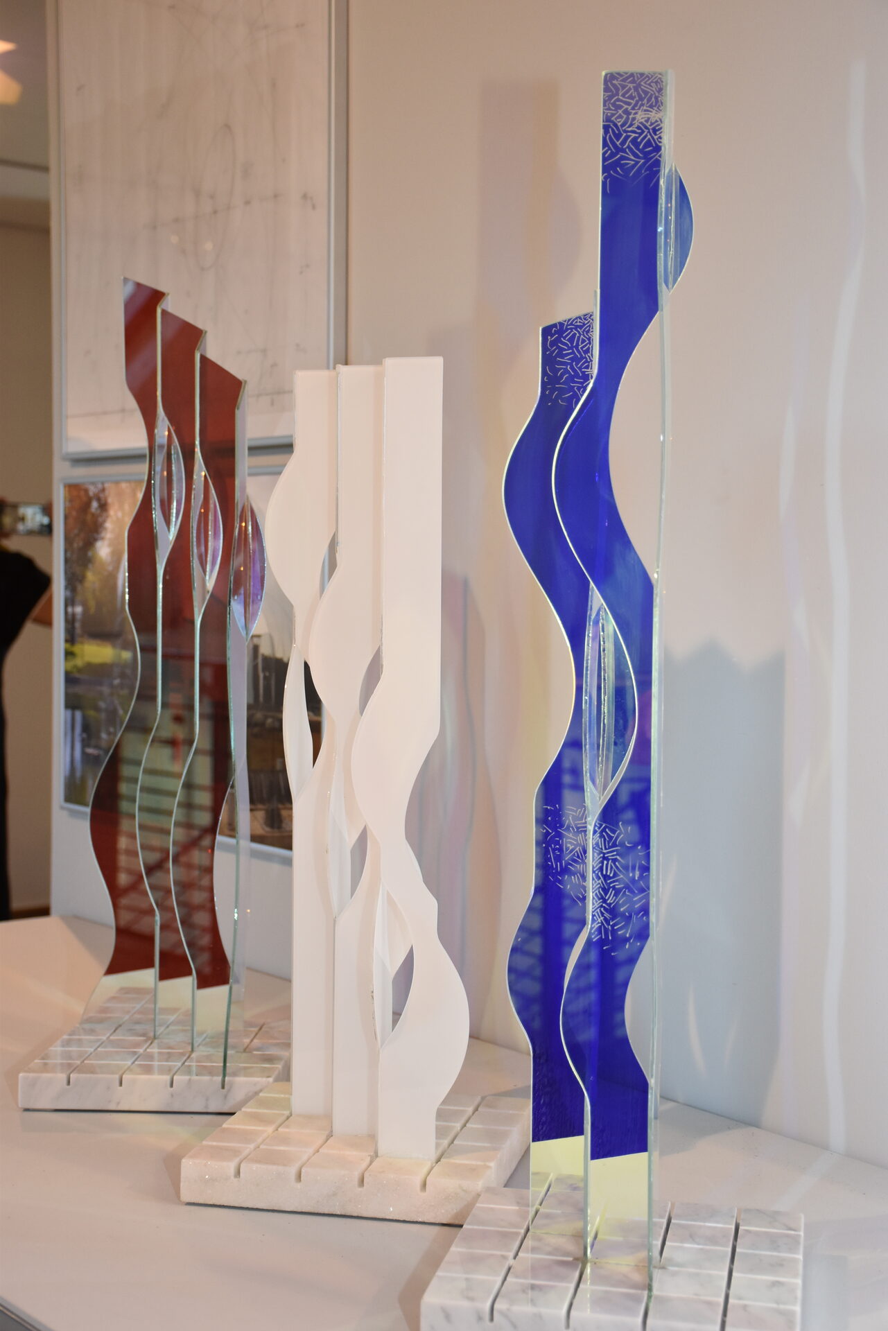 Glasstelen, die mit dem Licht spielen und immer mit jedem Perspektivwechsel andere Farben zeigen, schmücken neben vielen anderen gläsernen Werken die Ausstellungsräume des Glasmalerei-Museums.