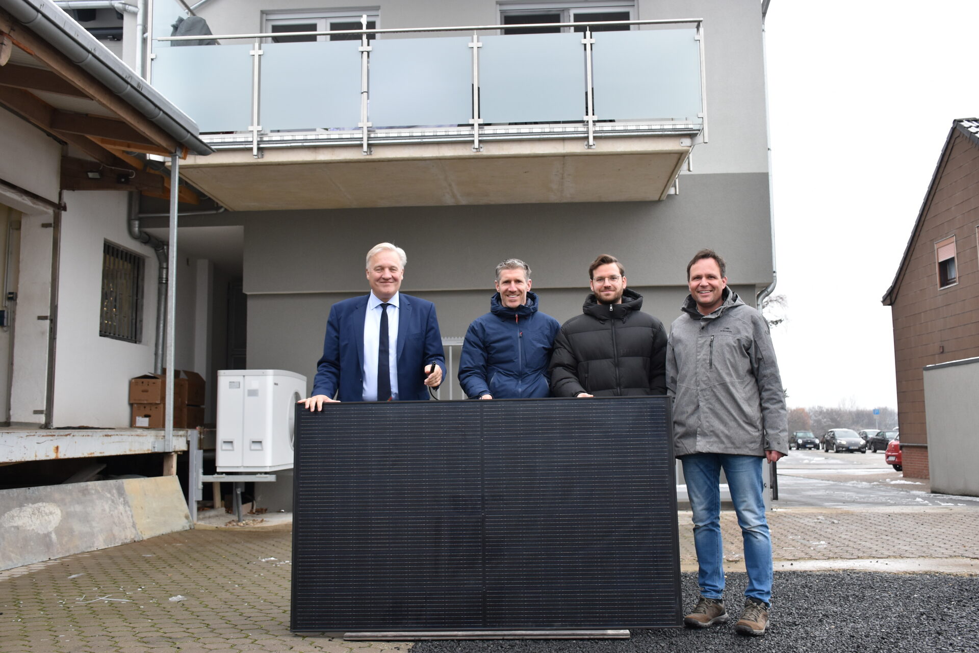 Landrat Wolfgang Spelthahn (l.) besuchte das Unternehmen von Stephan Meuthen (r.) in Langerwehe, der das Klimaschutzprogramm neben vielen weiteren Partnern unterstützt. Der Landrat machte sich vor Ort mit Klimaschutzmanager Eric Floren (2.v.l.) und seinem Kollegen David Urban ein Bild von den Anlagen.