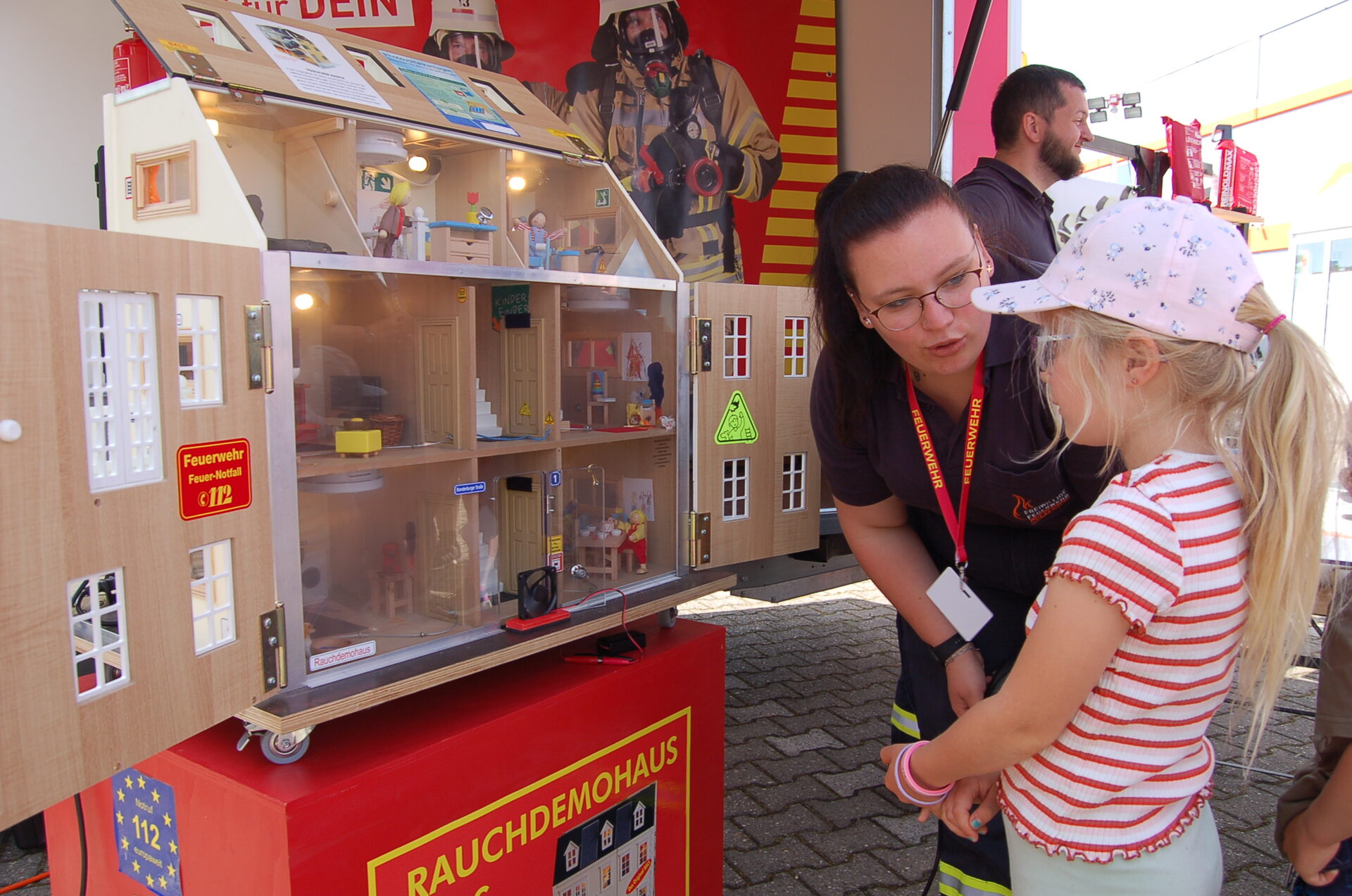 Zum Beispiel Franceska Heinecke. "Guck' mal, was passiert, wenn die Feuerwehr das Gebläse an der Haustür einschaltet", sagte sie zu einem Mädchen, das von der Seite durch eine Plexiglasscheibe in ein mehrstöckiges Modellhaus schaute, das vor ihr auf dem Tisch stand. "Da wir oben ein Fenster geöffnet haben, wird der Rauch dort aus dem Haus gedrückt. Damit haben wir Feuerwehrleute freie Sicht, wenn wir Menschen retten müssen", erläuterte die 23-jährige Aktive der freiwilligen Feuerwehr Nörvenich dem Kind. Sie selbst sei schon mit zehn Jahren in die Jugendfeuerwehr eingetreten und habe dann ihren Weg gemacht - so wie viele der freiwillig Aktiven.