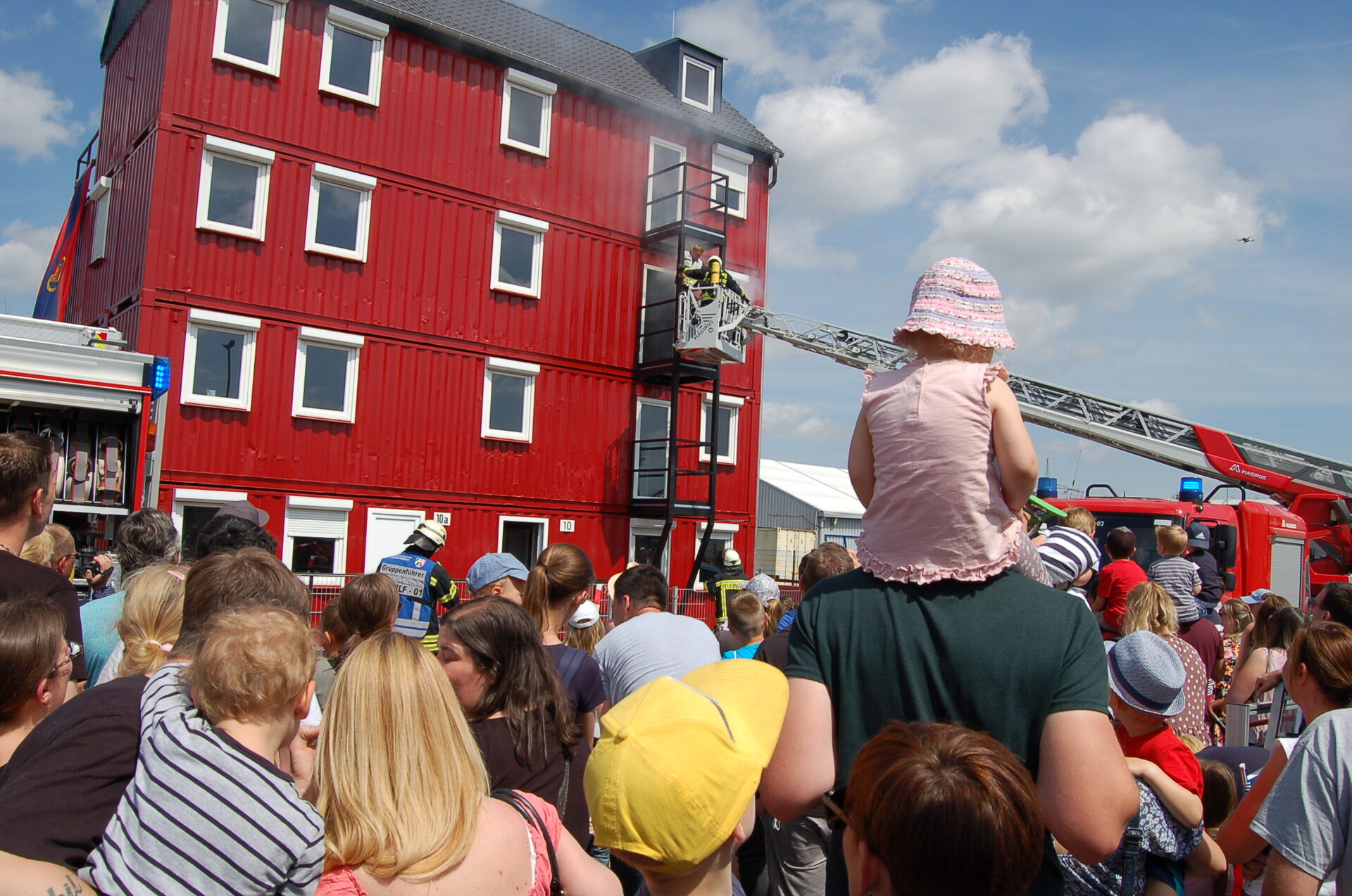 Feuerwehrkräfte demonstrierten, wie sie vorgehen, wenn eine Wohnung brennt, in der sich noch Menschen befinden.