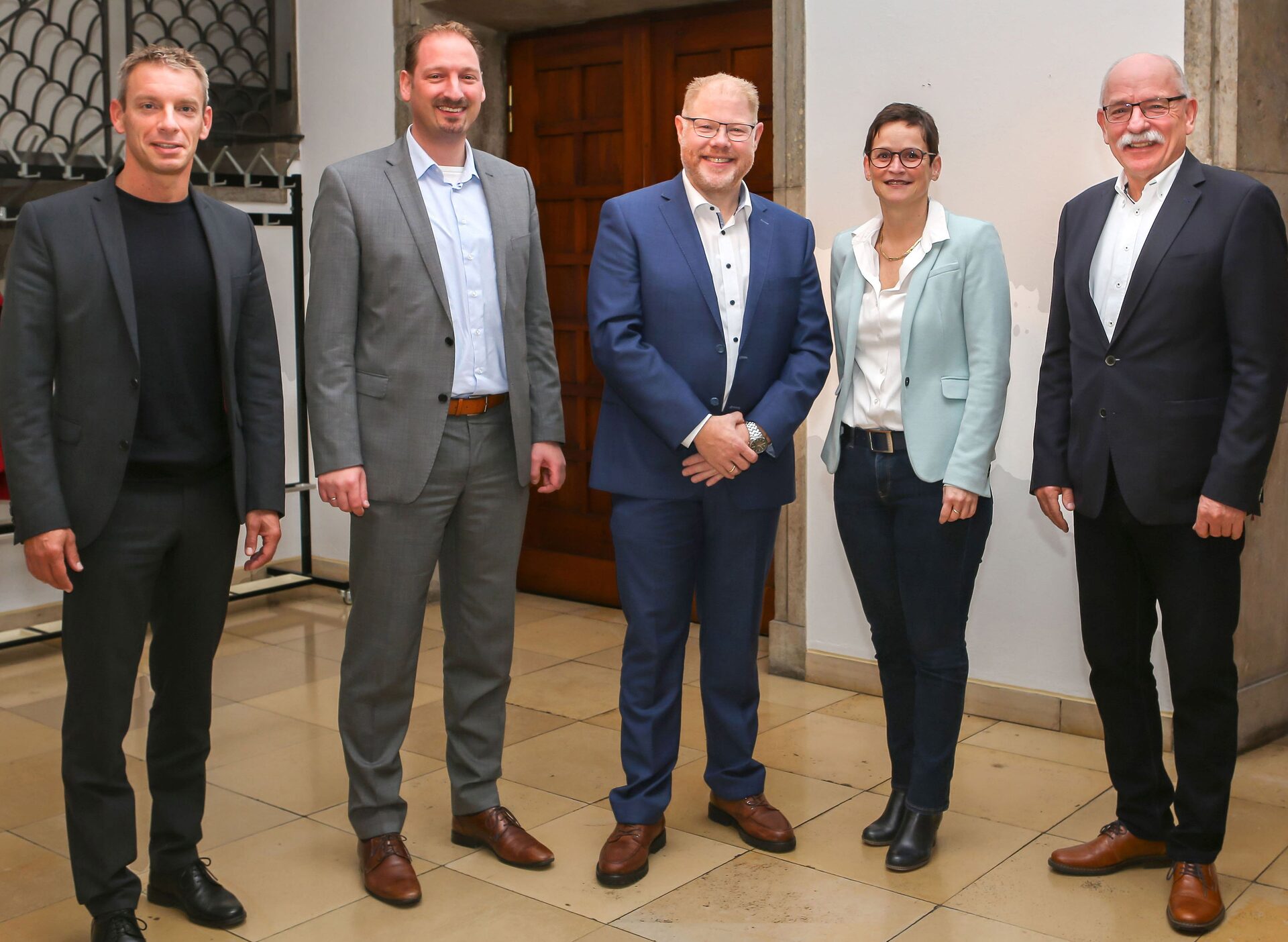Stephan Cranen (Bildmitte) nimmt Abschied vom Studieninstitut für kommunale Verwaltung Aachen. Sechs Jahre leitete er erfolgreich die kommunale Bildungseinrichtung. Dr. Markus Kremer (Stadt Aachen), Philipp Schneider (Kreis Heinsberg),Ellen Wirtz (StädteRegion Aachen) und Peter Kaptain (Kreis Düren), dankten Cranen für seine hervorragende Arbeit (Foto - von links nach rechts).