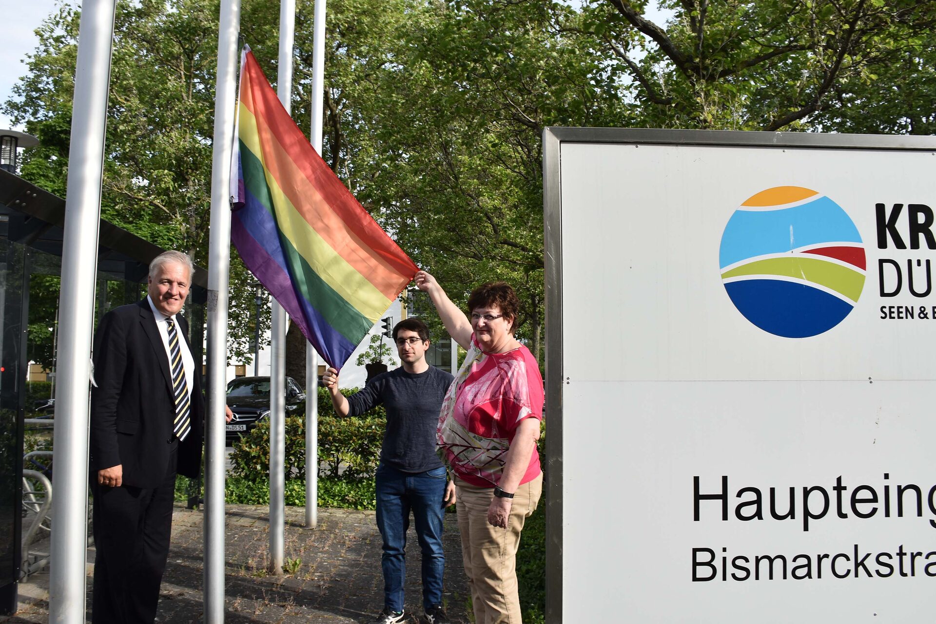 Am internationalen Tag gegen Homo-, Bi-, Inter- und Transphobie (IDAHOBIT) am Dienstag, 17. Mai, hat Landrat Wolfgang Spelthahn die Regenbogenflagge vor dem Kreishaus gehisst – gemeinsam mit Gudrun Zentis, Fraktionsvorsitzende der Grünen im Kreistag, und Giacomo Klingen, queerpolitischer Sprecher der Kreis-Grünen.