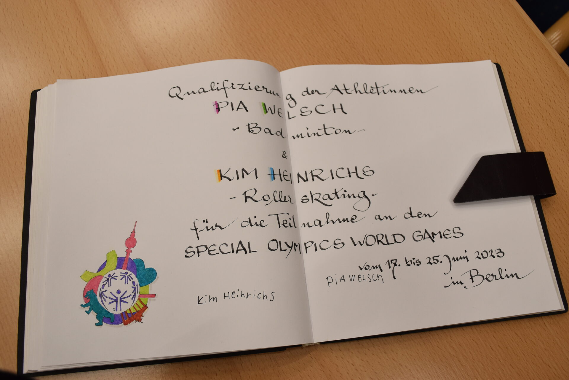 Pia Welsch ist 18 Jahre alt und tritt im Einzel sowie gemischten Doppel im Badminton an. "Der Eintrag in das Goldene Buch ist wirklich etwas ganz Besonderes für mich. Ich freue mich sehr auf Berlin, wir werden unser Bestes geben", erzählt sie mit leuchtenden Augen. Neben ihr sitzt die 16-jährige Kim Heinrichs mit einem freudigen Lächeln im Gesicht. "Das Ganze ist jetzt schon ein so großer Erfolg, mit dem ich niemals gerechnet hätte. Dass wir uns in das Goldene Buch des Kreises Düren eintragen durften, ist toll. So etwas erlebt man nur einmal im Leben."