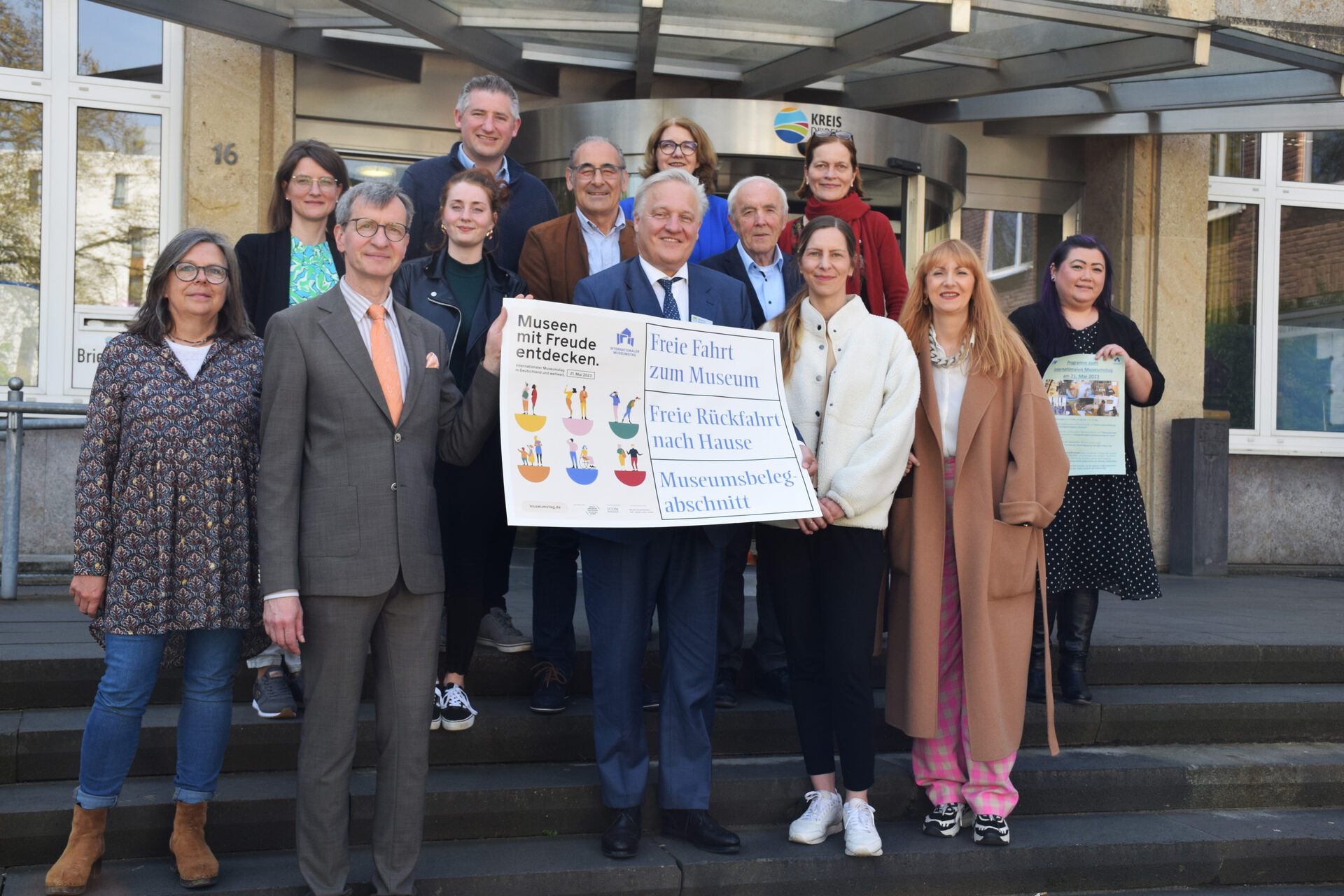 Landrat Wolfgang Spelthahn (Mitte) stellt mit den Vertreterinnen und Vertretern der Museen im Kreis Düren sowie der Rurtalbus und Rurtalbahn das Programm zum internationalen Museumstag vor.
