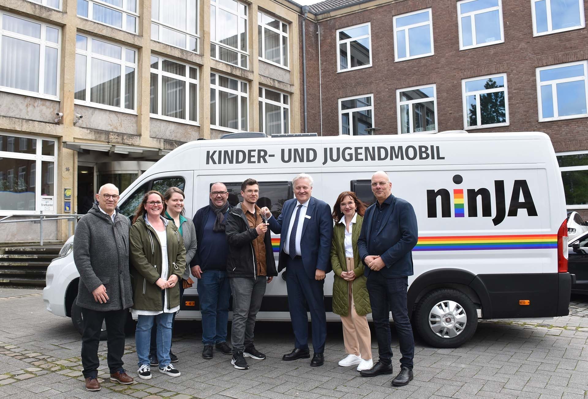 "Das neue Kinder- und Jugendmobil "ninJA" ist ein Symbol für den offenen Umgang mit queeren Kindern und Jugendlichen aus dem Kreis Düren. Wir wollen den vorhandenen Gesprächsbedarf nutzen, um noch mehr Akzeptanz zu schaffen. Und ich wünsche natürlich stets eine gute Fahrt", betont Landrat Wolfgang Spelthahn bei der feierlichen Vorstellung des Jugendmobils im April. Dieses wird in der Trägerschaft des Kreises Düren betrieben und die durchführende Institution ist der Sozialdienst katholischer Frauen (SkF) Düren.