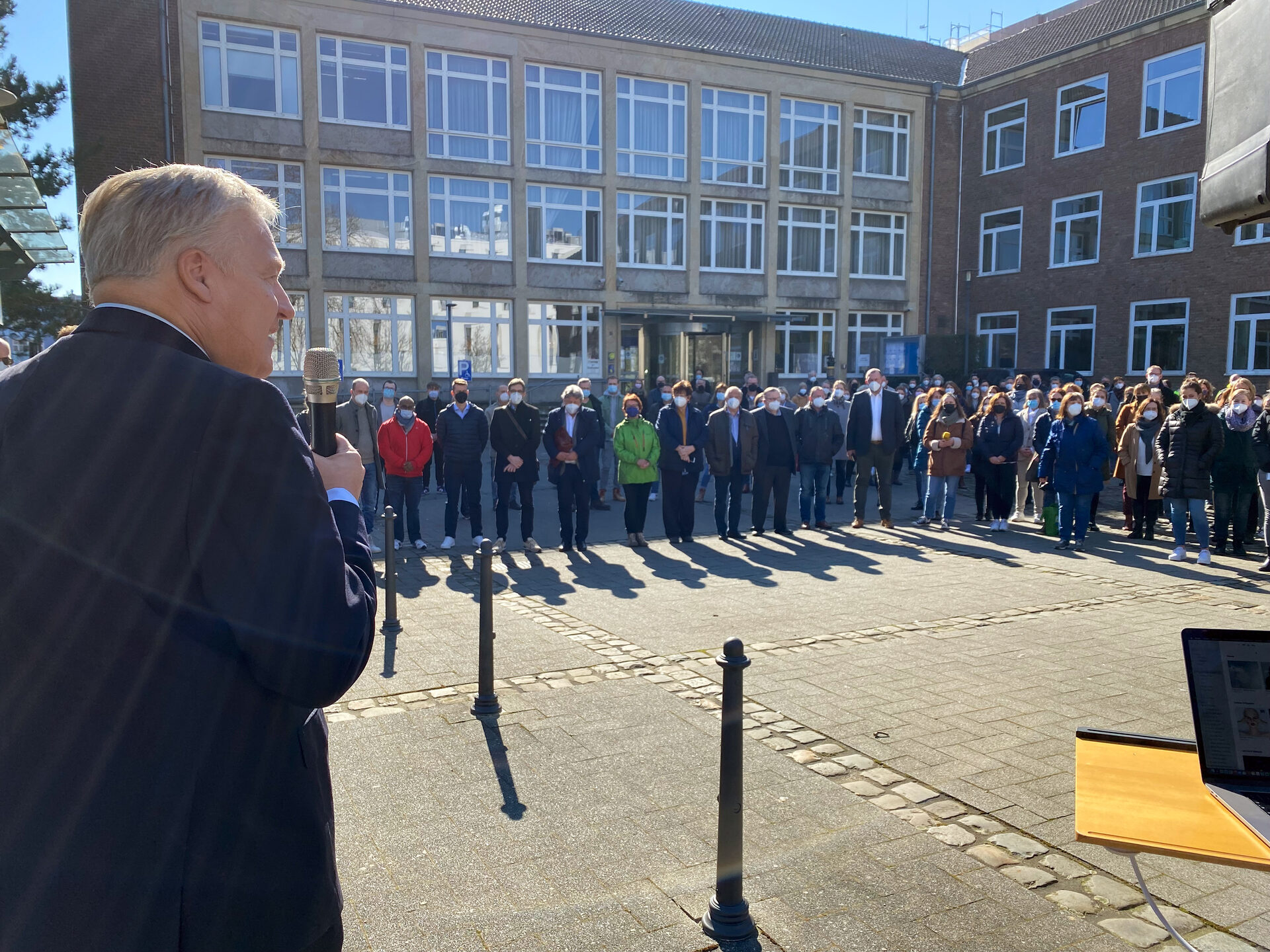 Das vergangene Jahr war geprägt vom Krieg in der Ukraine. Landrat Wolfgang Spelthahn redet bei einer Kundgebung vor dem Kreishaus.