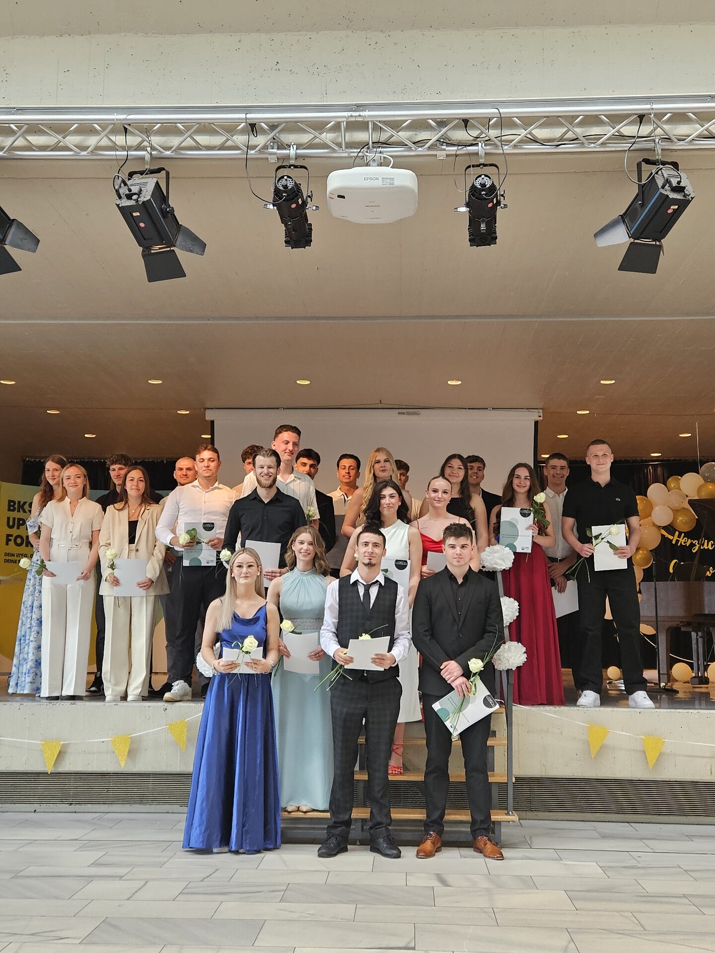Bei den Feierlichkeiten Ende Juni in der Aula des Berufskollegs gab es anerkennende Grußworte des Leitenden Polizeidirektors der Kreispolizeibehörde Düren, Stefan Thomaßen, von der Leitenden Regierungsschuldirektorin der Bezirksregierung Köln, Dorothea Scherer, sowie von dem derzeitigen Behördenleiter der Polizei Aachen, Andreas Bollenbach. Musikalisch wurde das Programm durch den singenden Polizeihauptkommissar Oliver Schmitt sowie der Absolventin Alyssa Lauterbach abgerundet. Bei einem Rückblick der Klasse mit der Bildungsgangleiterin Mirja Ramacher auf die gesamte Schulzeit zeigte sich, wie abwechslungsreich der Bildungsgang mit den Praktika in den verschiedenen Polizeibehörden und Dienststellen war.
