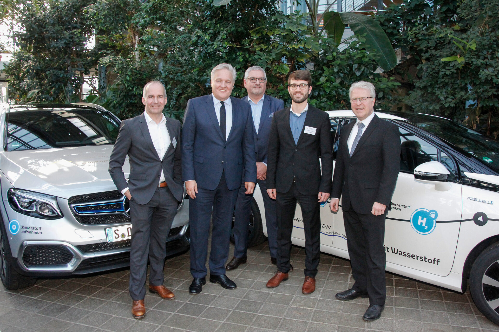 Landrat Wolfgang Spelthahn (2.v.l.) mit Johannes Kunsmann (Mercedes), Frank Still (Toyota), Dr. Johannes Kuhn und Prof. Bernhard Hoffschmidt (v.l.) vor den beiden Wasserstoffautos, die der Kreis Düren künftig nutzen wird.