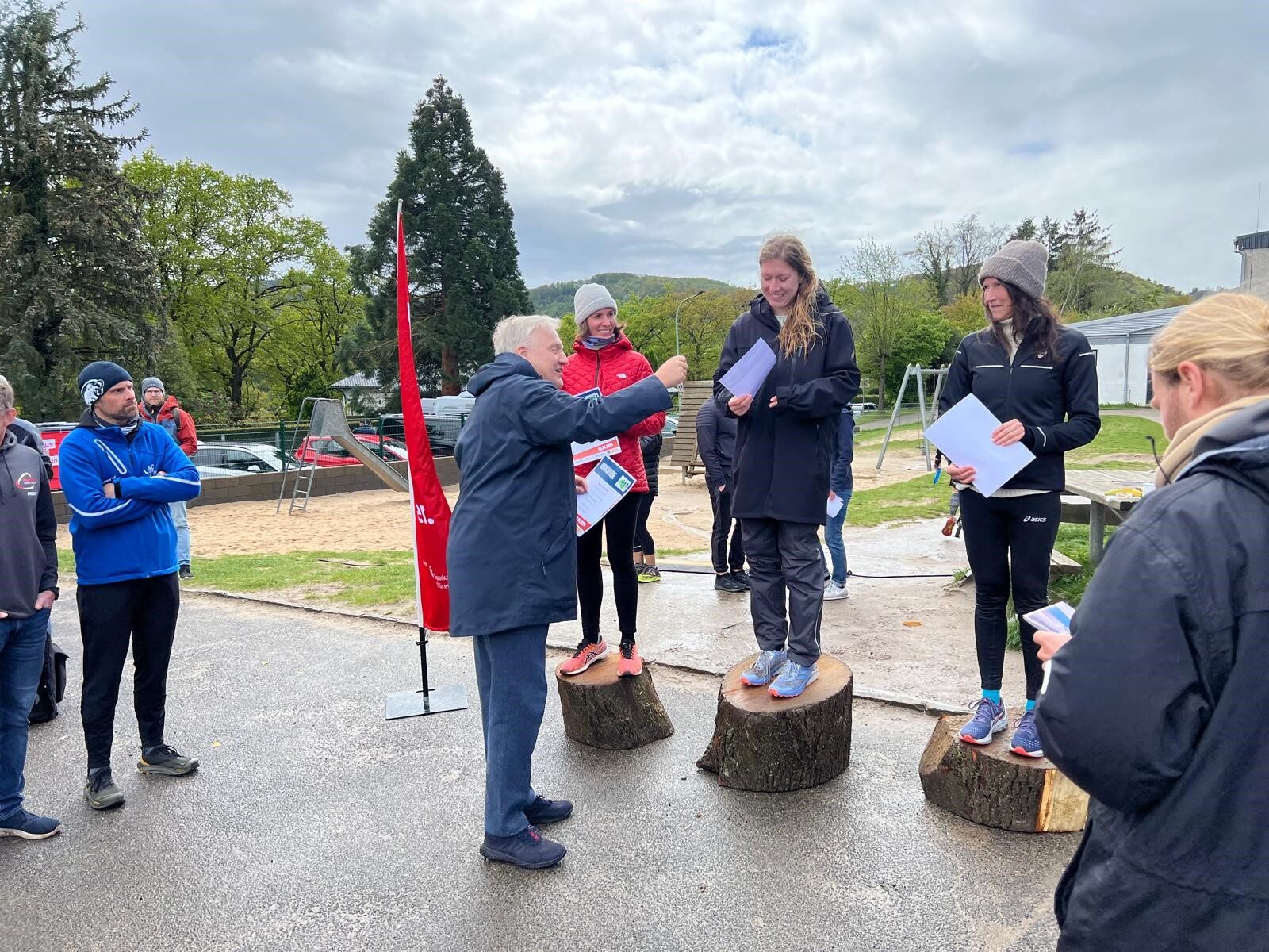 Voller Erfolg beim ersten Rureifel-Trail bei sehr durchmischtem Wetter. Landrat Wolfgang Spelthahn überreicht die Siegerurkunden an die drei Gewinnerinnen des 13-Kilometer-Laufs: Romy Julia Streppel, Sarah Mexner und Emanuela Hinz (v.l.).