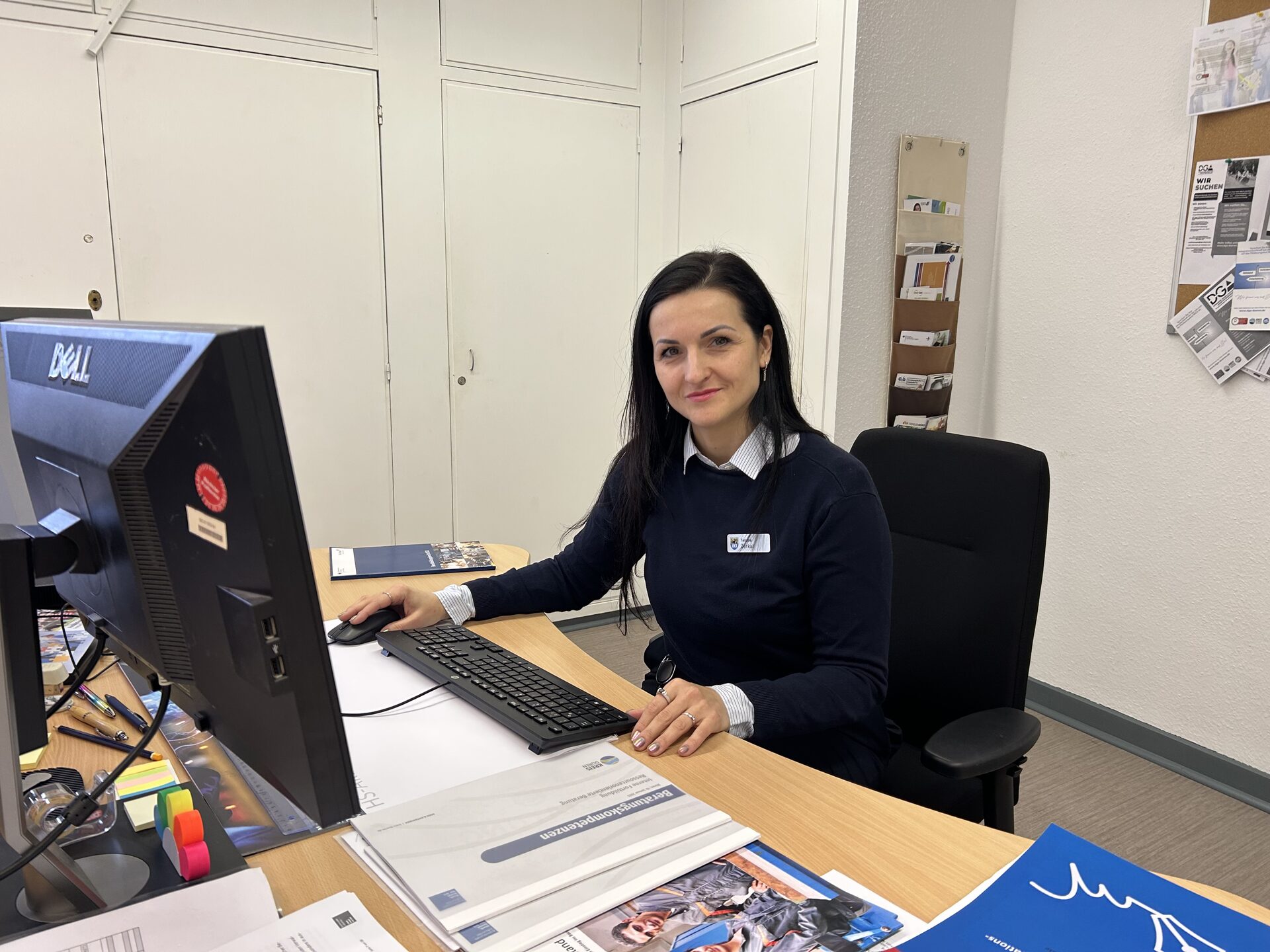 Währenddessen absolviert sie einen berufsbegleitenden Sprachkurs für das Niveau C1, den ihr das Jobcenter vermittelt. Außerdem bildet sie sich in der Bürokommunikation fort. Im Team der job-com fühlt sie sich sofort willkommen. „Die Menschen, die ich beim Jobcenter getroffen habe, waren immer bereit, mir zu helfen und wertvolle Ratschläge zu geben. Es ist wichtig, zu erkennen, dass man nicht alleine ist und dass es immer Unterstützung gibt – sei es durch den Arbeitgeber, durch Kollegen oder Integrationskurse.” Tetiana Zerkal macht die Arbeit im Brückenjob Spaß, sie beobachtet viel und lernt die Abläufe im Jobcenter besser kennen. Im Oktober 2024 wird sie als Integrationsfachkraft im Team der Personalvermittlung übernommen. Jetzt führt sie selber Beratungen durch, begleitet Menschen aus der Ukraine auf dem Weg zu einem Job. „Ich fühle, dass ich nützlich sein kann für andere Leute. Als Fachangestellte habe ich jetzt noch viel mehr Möglichkeiten zu helfen.” Die Ukrainerinnen und Ukrainer, die zu ihr kommen, fühlen sich laut eigener Aussage bei ihr weniger fremd und sicherer. Nicht nur wegen der Sprache, sondern auch weil sie bei vielen Fragen zur deutschen Bürokratie helfen kann.