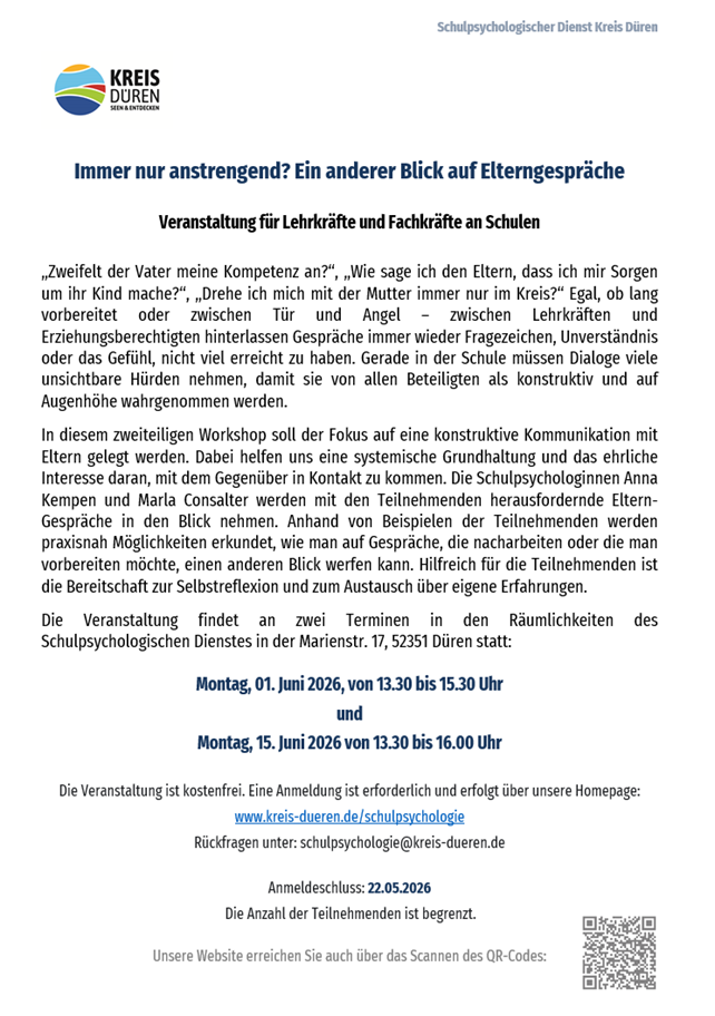 Hier geht es zur Anmeldung:zur Anmeldung "Immer nur anstrengend? Ein anderer Blick auf Elterngespräche" (Öffnet in einem neuen Tab)