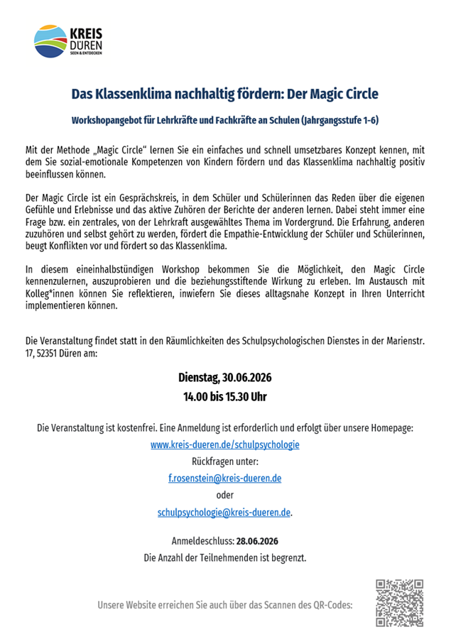 Hier geht es zur Anmeldung:zur Anmeldung "Das Klassenklima nachhaltig fördern: Der Magic Circle" (Öffnet in einem neuen Tab)