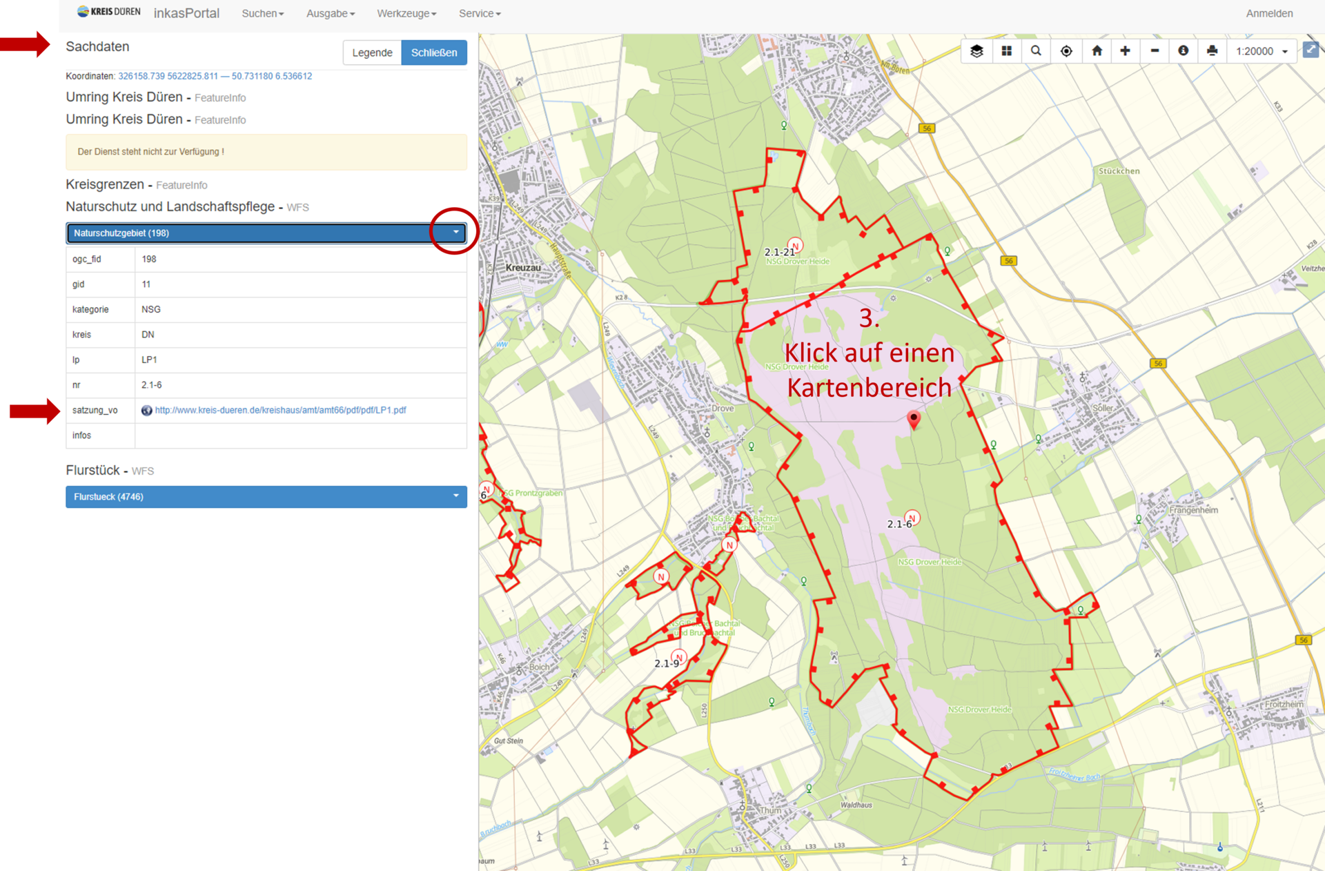 Mit Hilfe des Icons „Sachdatenanzeige" (i) können weitere Informationen zu den jeweiligen in der Karte zur Anzeige ausgewählten Layer (z.B. Naturschutzgebiete) abgerufen werden.
