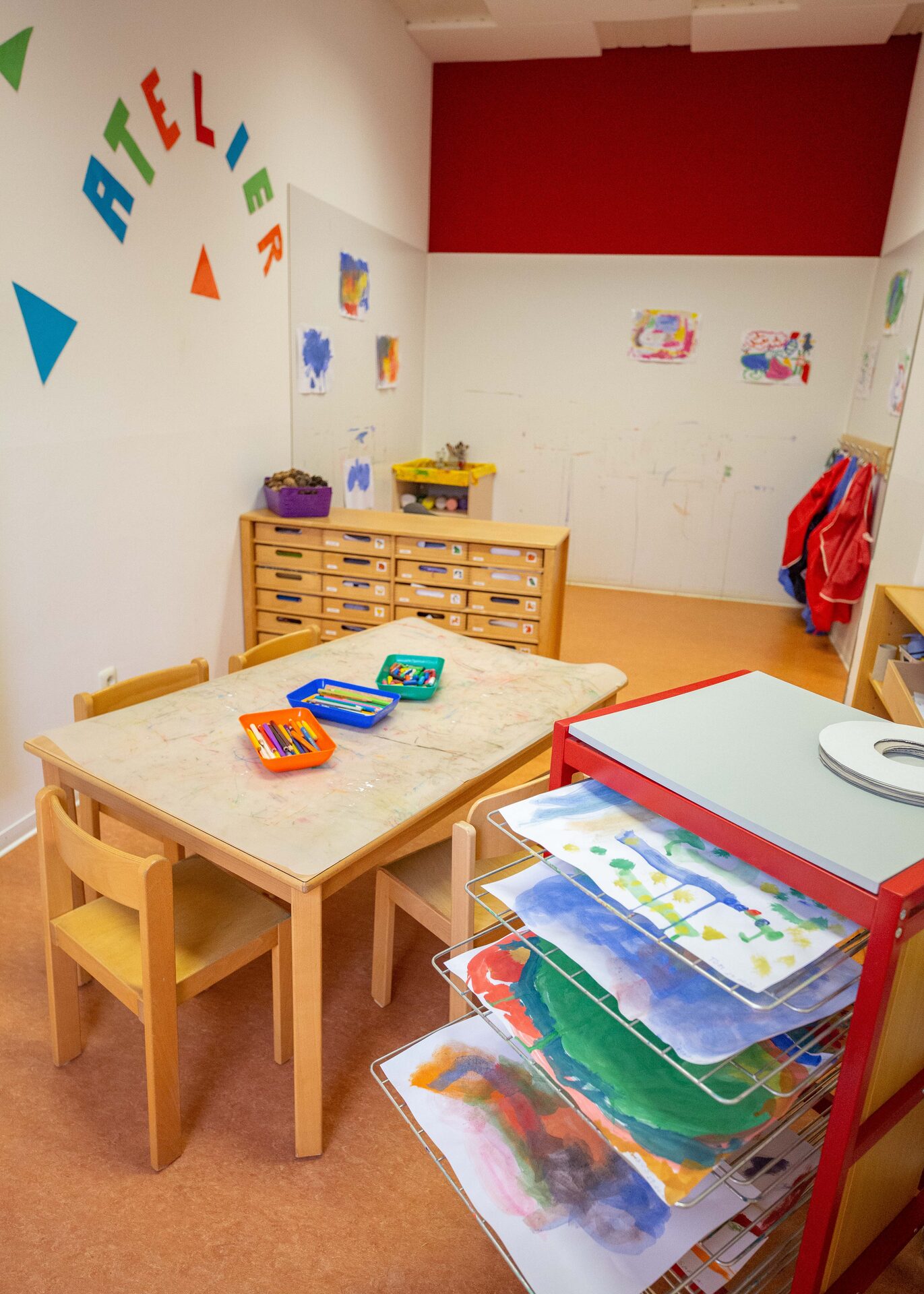 Kreativecken motivieren die Gestaltungslust unserer Kinder. Kleber, Stifte und unterschiedliches Papier gehören zum Standartangebot zur altersentsprechenden, freien Verfügung.