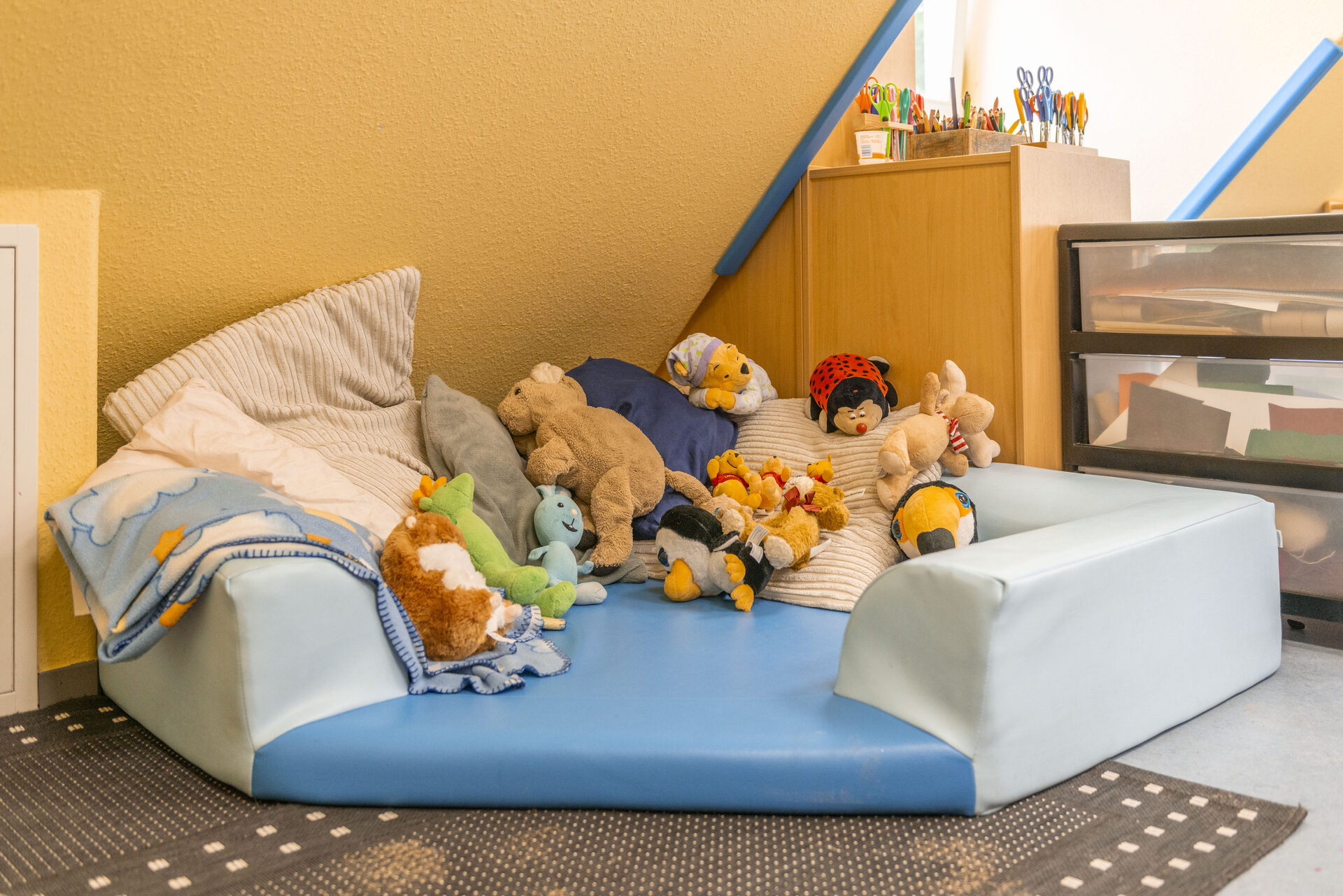 Unsere Räumlichkeiten befinden sich auf zwei Etagen, sie bieten Platz für vielfältige und unterschiedliche Angebote und bieten zugleich Sicherheit und Geborgenheit. Jedes Kind hat eine feste Gruppe (Stammgruppe). Da unsere Türen alle offen sind, können die Kinder sich gegenseitig besuchen, was auch gerne angenommen wird. Wir arbeiten Gruppenübergreifend, dass bedeutet, das Kinder in Kursen und Angeboten zusammentreffen. Jede Gruppe verfügt über 1 Waschraum, 1 Abstellraum, 1 Gruppenraum und 1 Nebenraum. In der oberen Etage befindet sich 1 Wickelraum und ein 1 Mehrzweckraum. In der unteren Etage befindet sich 1 Spielflur, die Küche und das Büro.
