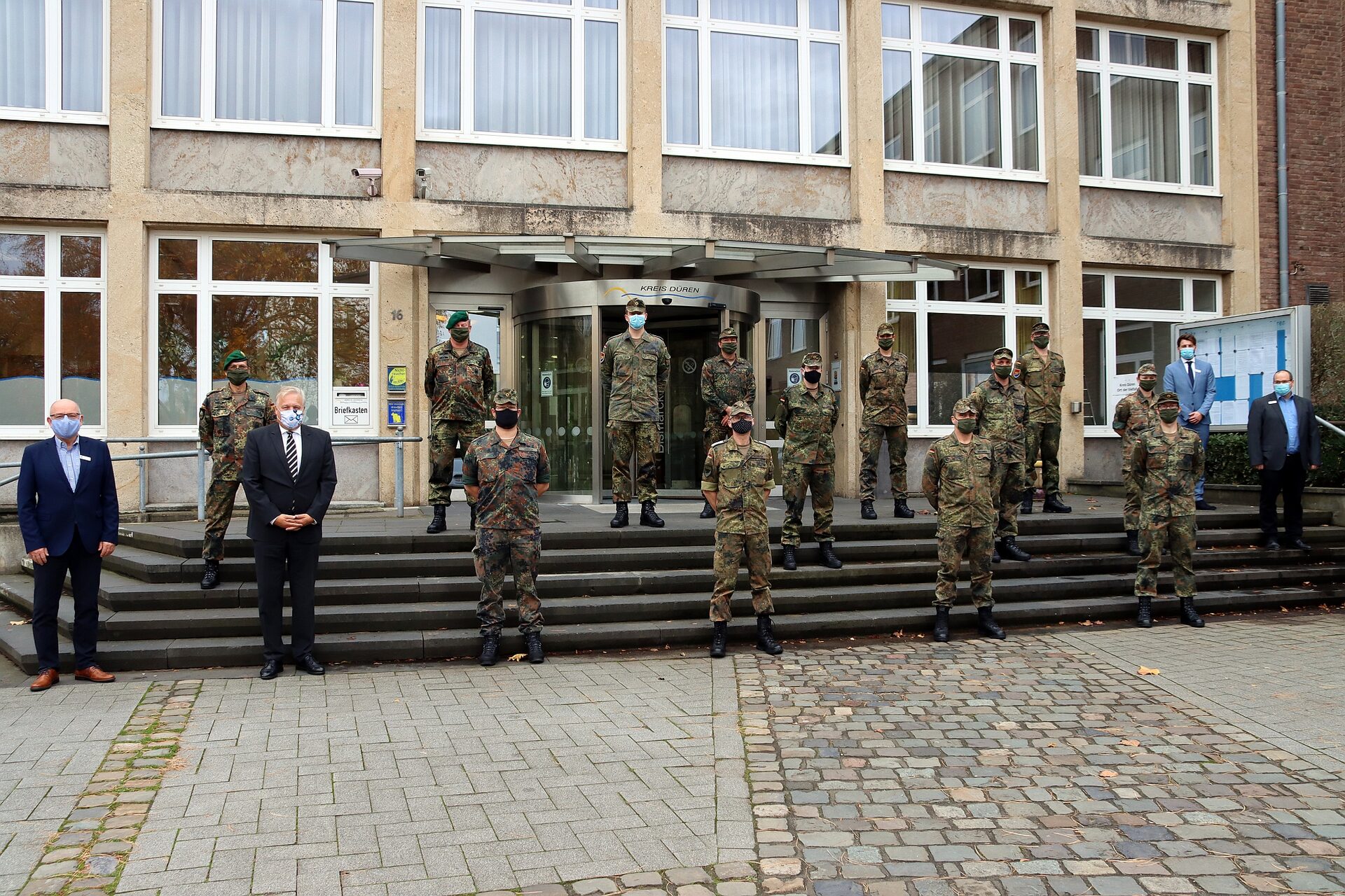 Seit heute (2.11.) verstärkt die Bundeswehr den Kreis Düren bei der Kontaktnachverfolgung. Landrat Wolfgang Spelthahn begrüßte die 10 Soldatinnen und Soldaten und stellte ihnen kurz das Kreisgebiet vor. "Sie leisten eine enorm wichtige Arbeit", betonte der Landrat, "vielen Dank dafür." Neben der Bundeswehr wird der Kreis ab dieser Woche auch von Studenten und Abiturienten bei der Kontaktnachverfolgung unterstützt.