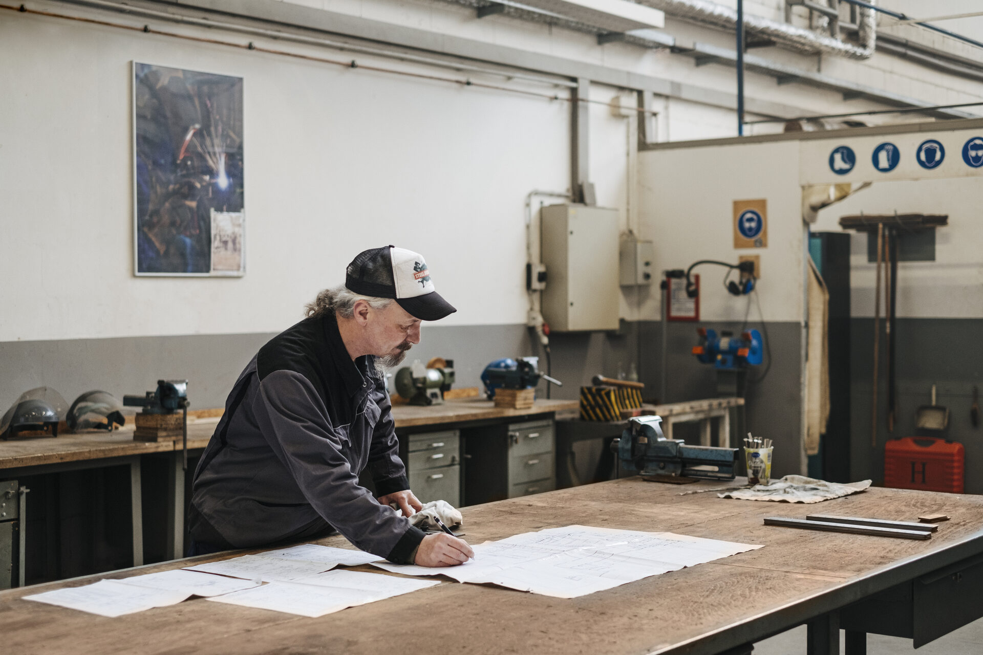 Wenn Björn Mehren über seine Lieblingsbeschäftigung spricht, beginnt es in seinen Augen zu funkeln. „Schweißen“, sagt er, „und Gewinde schneiden!“. Der 51-Jährige schätzt die Arbeit und die Produkte in der Schlosserei – so wie die kunstvolle Metallskulptur, auf die er im Vorbeigehen zeigt. Plötzlich bleibt er stehen und fährt mit seinen Händen über die blank polierte Stahlseite einer Parkbank, die sein Kollege gerade gebaut hat. Mit ruhigem rheinländischen Akzent erklärt er, wofür er die Werkzeuge und Maschinen ringsherum benutzt. Dann setzt er den Schweißhelm auf, nimmt den Brenner in die Hand und lässt die Funken sprühen. Björn Mehren bewegt sich so selbstverständlich durch die Halle als würde er dort wohnen. Und tatsächlich: „Es ist wie nach Hause kommen“, sagt er über seine Arbeit.