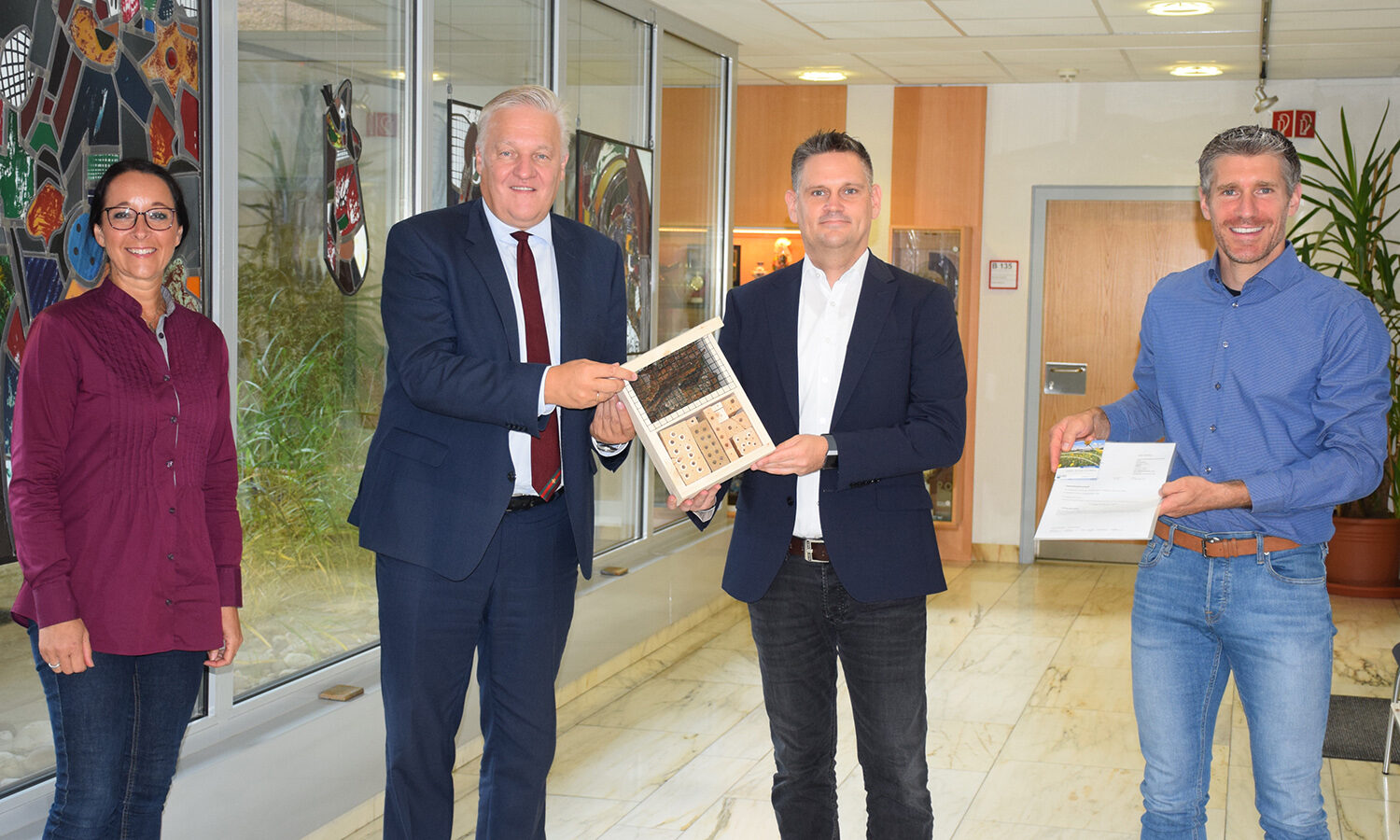 "Ich war erstaunt, wie schnell und unkompliziert die Förderung abgewickelt wurde", sagte Cremer. Zudem fühlte er sich durch das Amt für Kreisentwicklung und Wirtschaftsförderung gut beraten bei dem Weg hin zur Förderung. Um das Klimaschutzpaket abzurunden, überreichte Landrat Wolfgang Spelthahn ihm dann noch ein Insektenhotel aus dem Klimaschutzprogramm 2020 und einige Saatgut-Tütchen aus dem diesjährigen Programm, um die Insekten auch bestens zu versorgen.