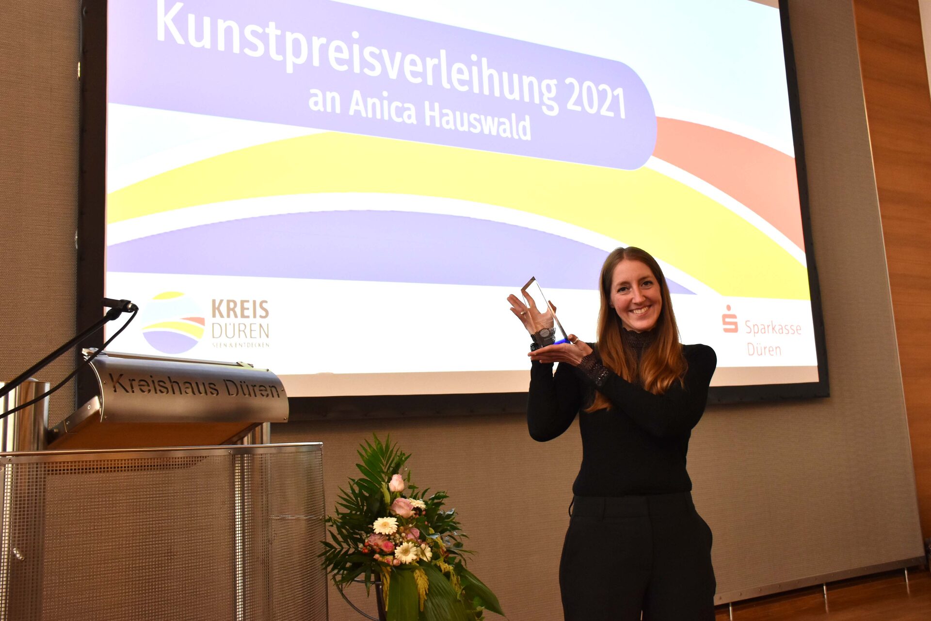 Machte sie sich zunächst vor allem mit Kunstfell-Arbeiten einen Namen, so steht nun vor allem die freie Malerei im Mittepunkt ihres Schaffens. Besonders in der Coronapandemie half ihr die Kunst. "Im Außen war so viel Stillstand, Negativität und Angst, dass ich dem etwas entgegensetzen musste", sagte sie. So kamen besonders Licht, Farbe und Bewegung in ihren Werken zum Ausdruck. Eine hochrangige Jury wählt alle zwei Jahre die Preisträger aus, die in besonderer Weise mit dem Kreis Düren verbunden sind.