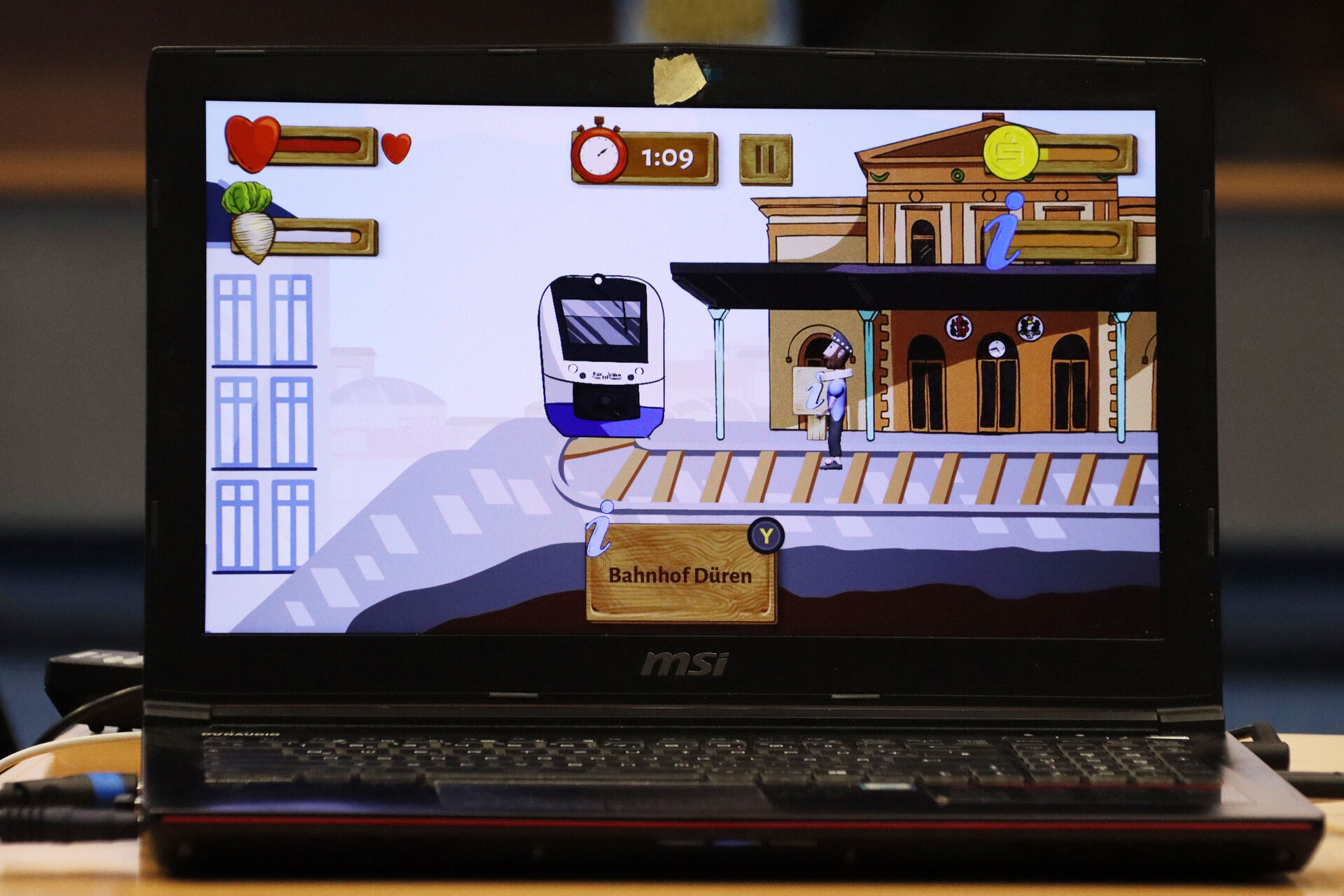 Unterwegs gibt es auf den sechs unterschiedlichen Leveln viel Nützliches und Wissenswertes aus dem Kreis Düren – wer die Infos liest, was sich sehr empfiehlt, bekommt Sonderpunkte oder erfährt sonstige Vorteile. Diese Erfahrung machte auch die 13-jährige Emma Adrian-Papworth, die das Spiel live testete.