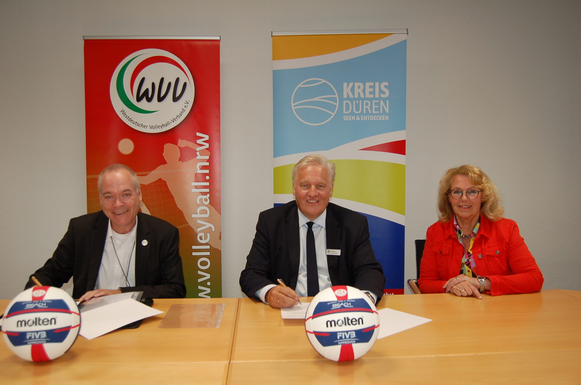 Wurden die Sand-Champions zuletzt Corona-bedingt auf der kleinen, umzäunten, mitten im Grünen gelegenen DTV-Beach in Düren ermittelt, so kehrt das Turnier nun wieder auf den Schlossplatz im Herzen der Stadt Jülich zurück. Den Ausrichtungsvertrag für die Veranstaltung unterzeichneten Landrat Wolfgang Spelthahn, Initiator und zum 21. Mal Schirmherr des Turniers, und WVV-Präsident Hubert Martens jetzt im Kreishaus Düren. "Wir fühlen uns im Kreis Düren rundum wohl und freuen uns auf das Turnier in Jülich, wo die Bedingungen für die Spieler und Fans erstklassig sind", strahlte Hubert Martens nach der Vertragsunterzeichnung. Landrat Wolfgang Spelthahn erwiderte das Kompliment: "Wir können uns glücklich schätzen, den Menschen ein solch hochkarätiges Turnier einer mitreißenden Sportart anzubieten – und das dank unserer Sponsoren bei freiem Eintritt."