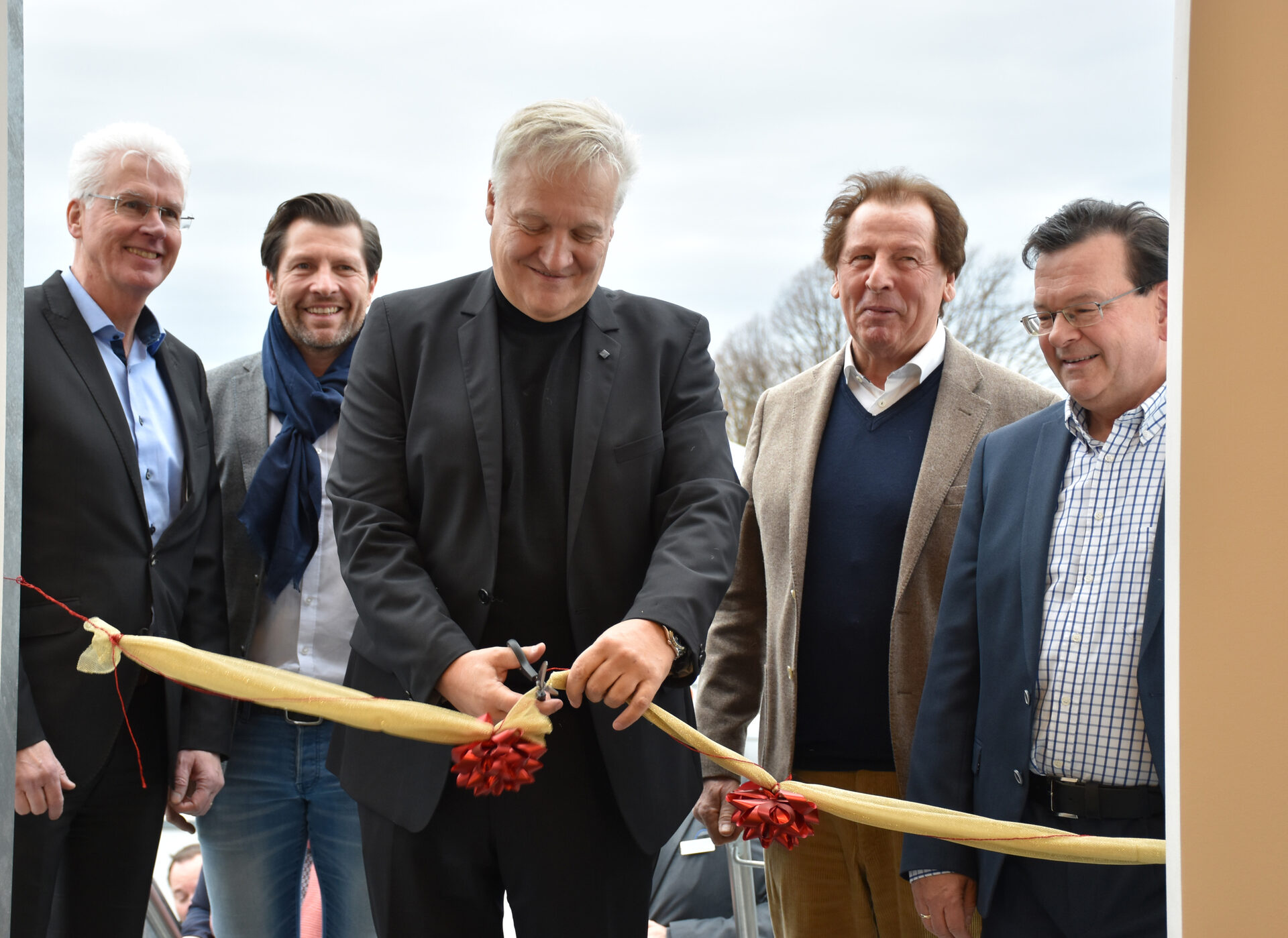 Landrat Wolfgang Spelthahn schneidet in Anwesenheit von Kreuzaus Bürgermeister und der Geschäftsführung das Band zum Eingang durch.