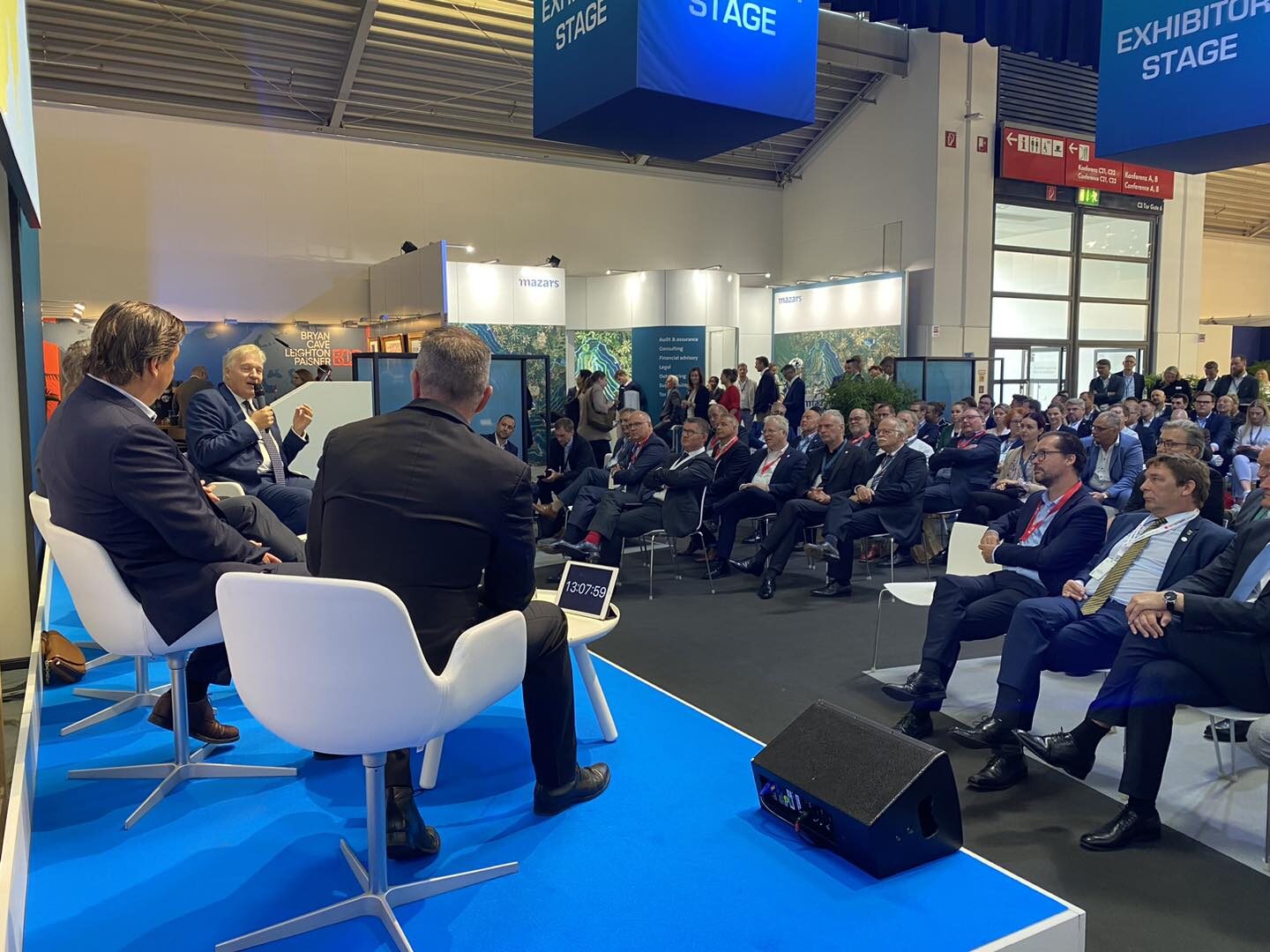Landrat Wolfgang Spelthahn (am Mikrofon) präsentiert auf der Immobilienmesse Expo Real in München die großen Vorteile des Kreises Düren.