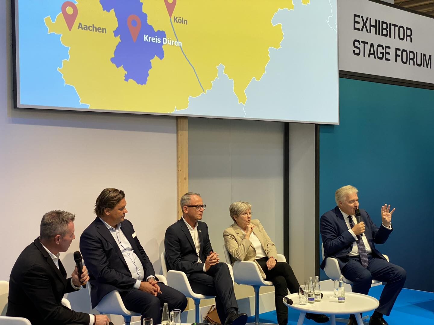 Die Stuhlreihen waren sehr gut gefüllt, immer wieder blieben Besucherinnen und Besucher zudem stehen, um dem informativen und unterhaltsamen Talk zu folgen. Mit dabei waren neben dem Landrat Prof. Dr. Christiane Vaeßen (Region Aachen Zweckverband), Mario Kmenta (Trivium GmbH) und Bernhard Sommer (Kern-Haus AG).
