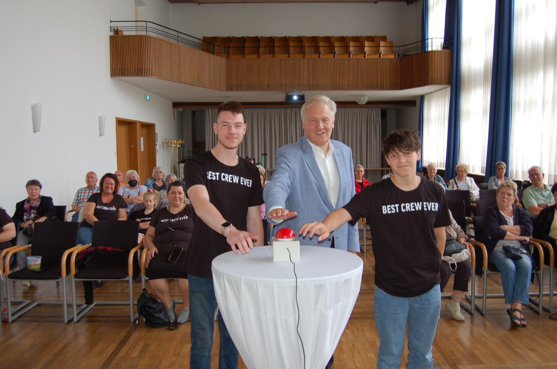 Ben Lorfing (r.) und Christian Werres (l.) bedienten bei der öffentlichen Verlosung der Zugfahrkarten für die Kreis Düren-Tage den Taster des Zufallsgenerators – wie schon 2019. Landrat Wolfgang Spelthahn begrüßte rund 30 Gäste im Kreishaus Düren. Foto: Kreis Düren