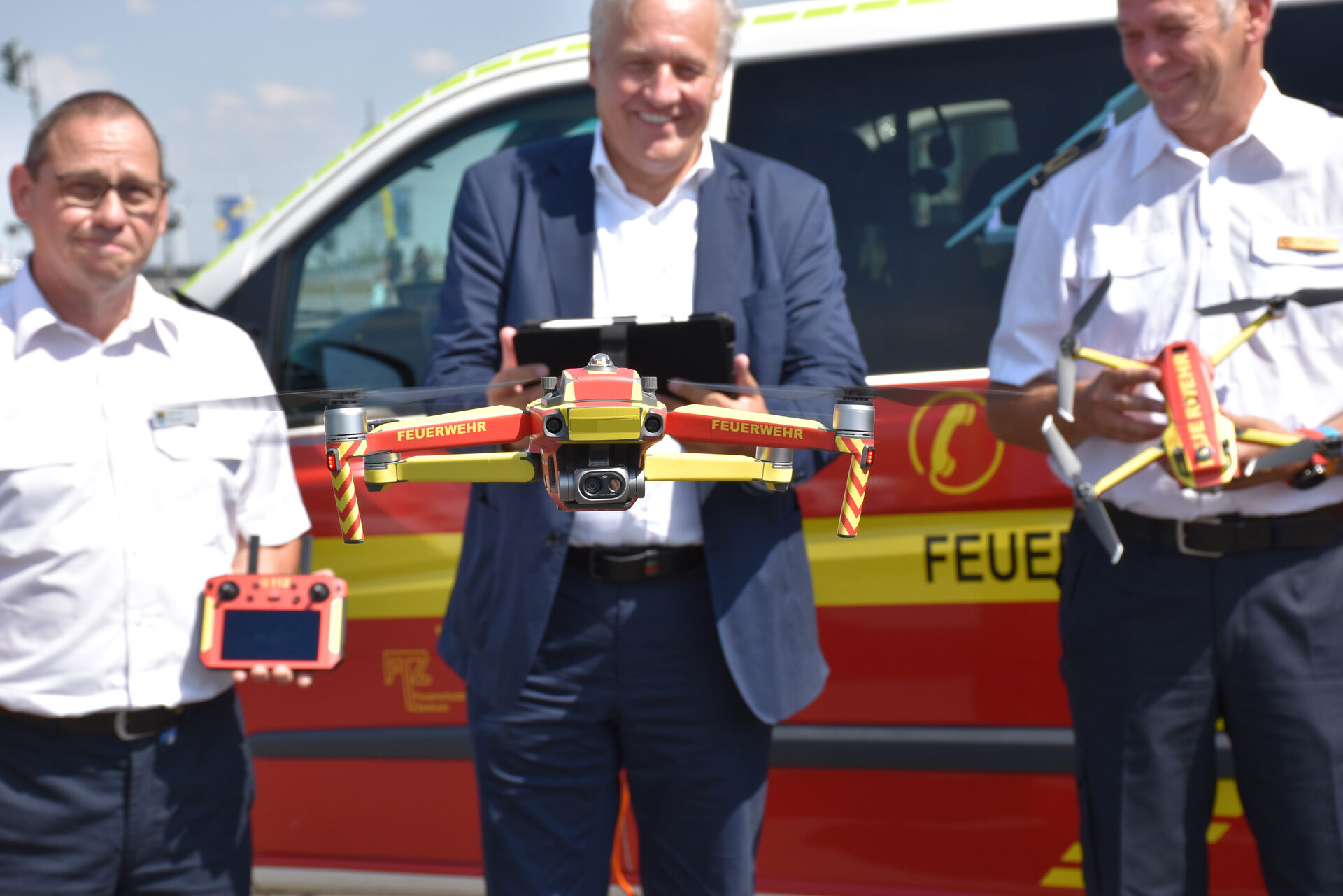 Landrat Wolfgang Spelthahn (Mitte), Kreisbrandmeister Karlheinz Eismar (links) sowie sein Stellvertreter Wilfried Thelen (rechts) bei der Übergabe der Drohneneinheit an die Feuerwehr Kreis Düren.