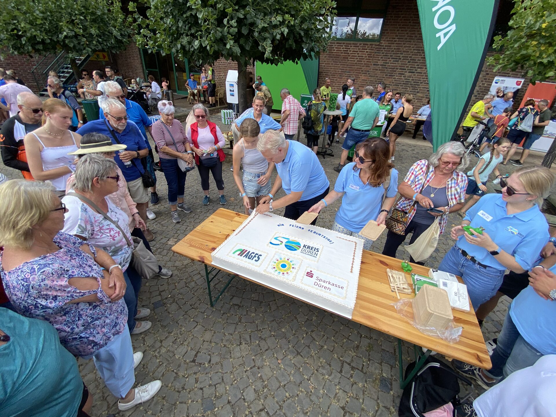 Auch später, als alle Teilnehmer wieder im Bubenheimer Spieleland waren, herrschte eine entspannte Atmosphäre. Zum 50. Geburtstag des Kreises Düren in diesem Jahr wurde eine kunstvoll verzierte Torte aufgetischt. Landrat Wolfgang Spelthahn verteilte die Stücke an die Radler, die sich die leckere Torte nach der Tour absolut verdient hatten. Neben dem Kreis Düren präsentierte sich der Verein Rureifel Tourismus, die Polizei und die AOK. Ein großer Spaß waren die Fotos, die vor einer grünen Leinwand (Greenscreen) gemacht wurden, um nachher ausgewählte Hintergründe einfügen zu können.