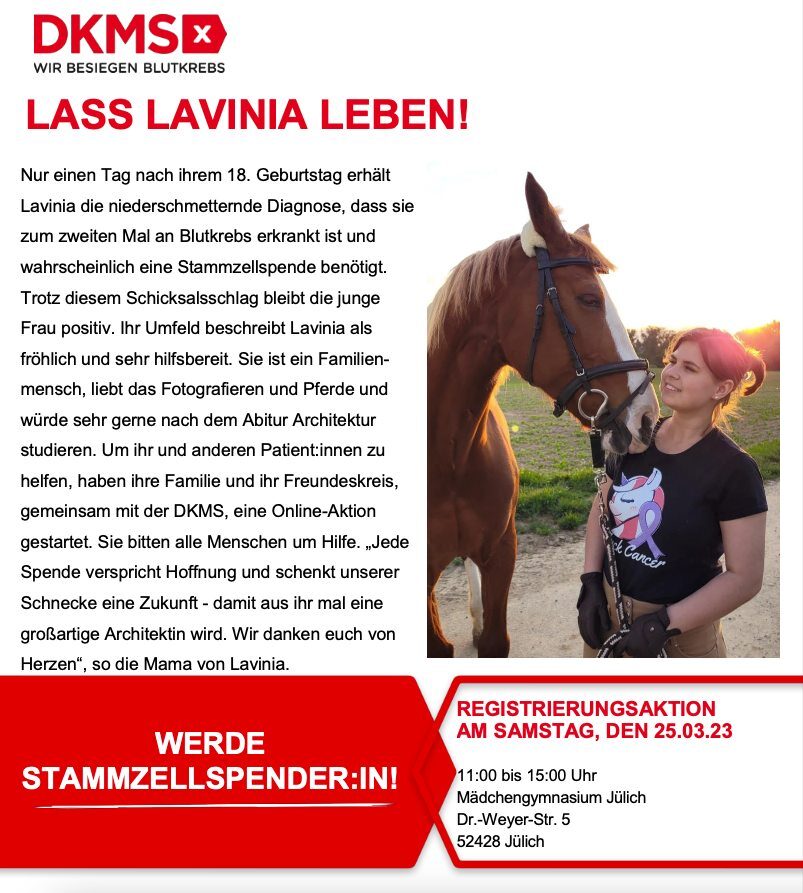 Um ihr zu helfen, haben ihre Familie und ihr Freundeskreis viele Aktionen gestartet, unter anderem gemeinsam eine Online-Aktion mit der DKMS (Deutsche Knochenmarkspenderdatei). Mehr Infos finden Sie hier: https://www.dkms.de/aktiv-werden/online-aktionen/lavinia (Öffnet in einem neuen Tab)