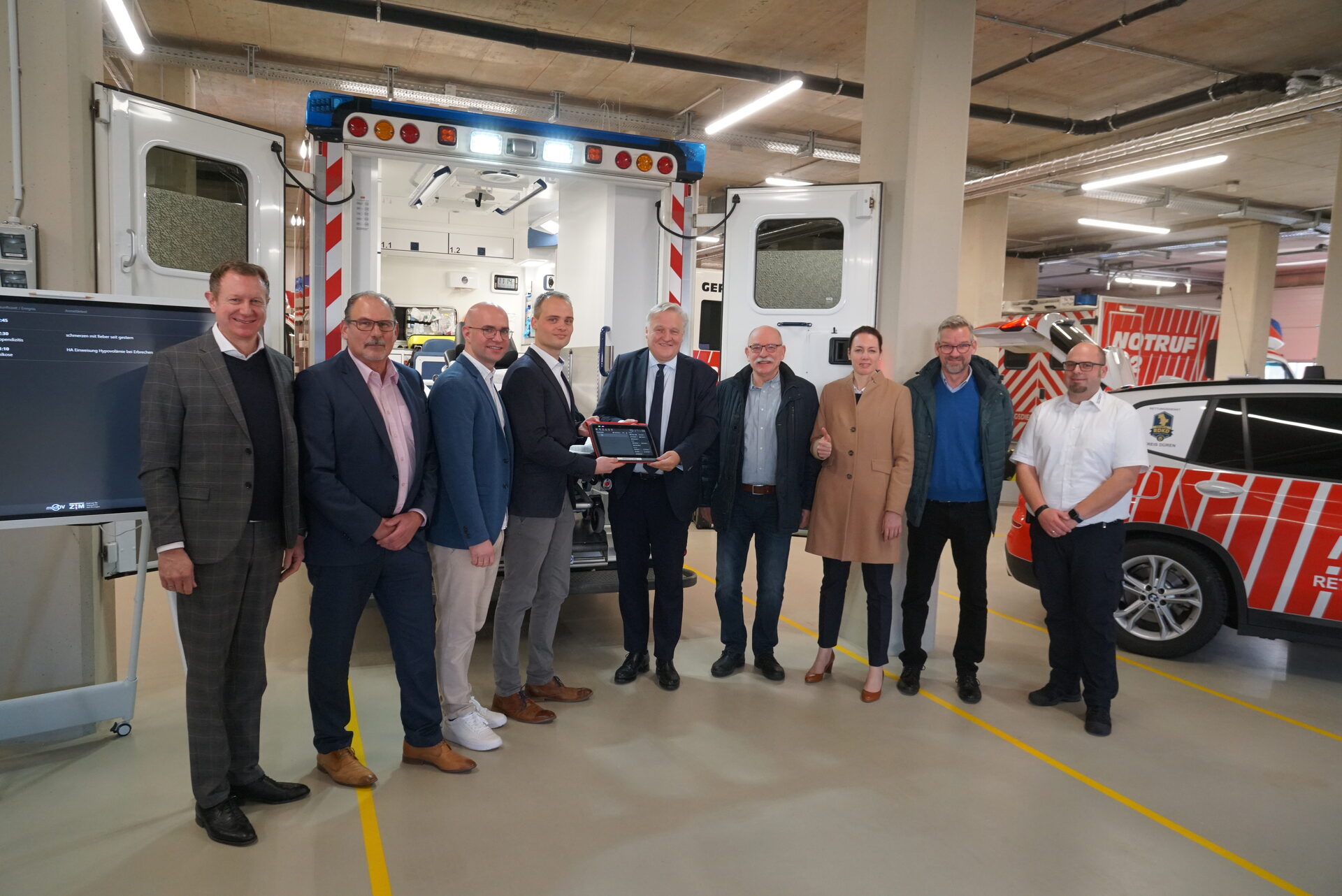 Die Krankenhäuser und der Rettungsdienst Kreis Düren stellen einen Meilenstein in der Patientenversorgung vor. Die Daten werden vom Notruf bis zur Aufnahme im Krankenhaus digital erfasst. Dr. Niklas Cruse (Krankenhaus Jülich), Renardo Schiffer (Krankenhaus Lendersdorf), Projektverantwortlicher Jens Juchem, Dr. Norbert Hambach (stellvertretender ärztlicher Leiter Rettungsdienst Kreis Düren), Landrat Wolfgang Spelthahn, Peter Kaptain (Vorstand RDKD), Kathleen Büttner-Hoigt und Dr. Georg Welty (beide Krankenhaus Düren) und Robert Engels (Leiter Einsatzdienste/v.l.) stellten das neue System vor.