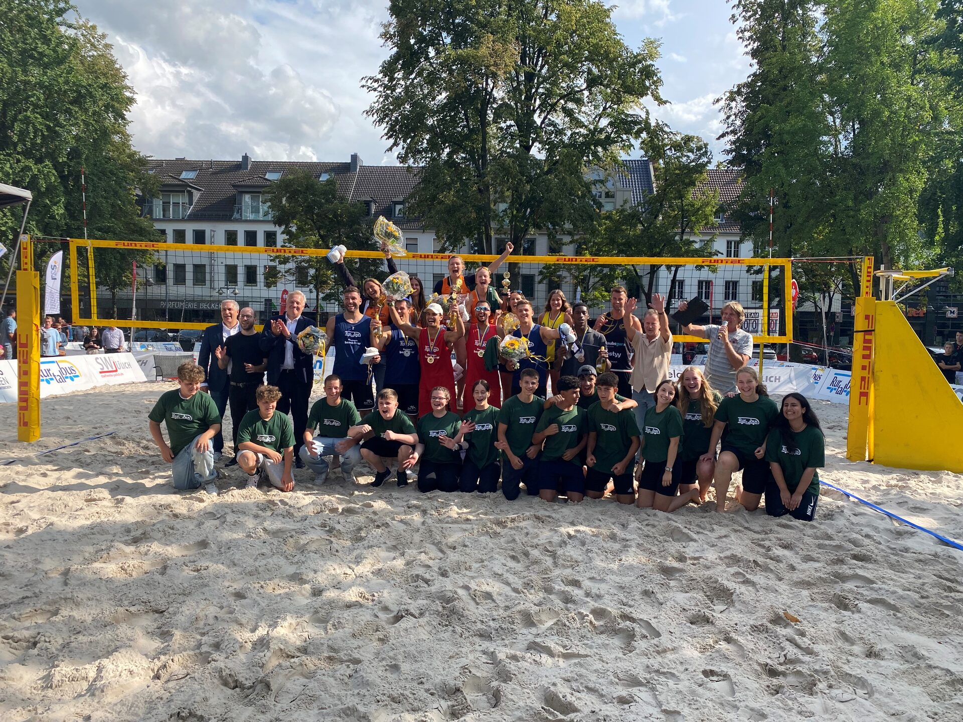 Bereits am Freitag, 25. August, machten die Freizeit- und Hobbymannschaften den Anfang und durften die Plätze, die mit rund 460 Tonnen Sand gefüllt sind, bespielen. Sie trotzten den Regenschauern, die teilweise runterkamen und zeigten viel gute Laune! Team Floatis holte sich den Sieg im Finale gegen Team Tequila und damit den SWJ-Cup, also Stadtwerke Jülich-Cup. Spannend auch: Die Jüngsten haben hier gegen die Ältesten gewonnen. Auf den Plätzen dahinter landeten „Take a bow“, „Los Blockos“, „Brachiale Bagger Buddys“, „Golden Girls“, „Skybeacher“, „Campus Crisps“, „Eine gute Michung“, „All4one“, „Volleybären“ und „Mein Lieblingsteam“. Das Hobbyturnier zeichnet sich neben der puren Spielfreude auch durch die kreative Namensgebung der Teams aus!