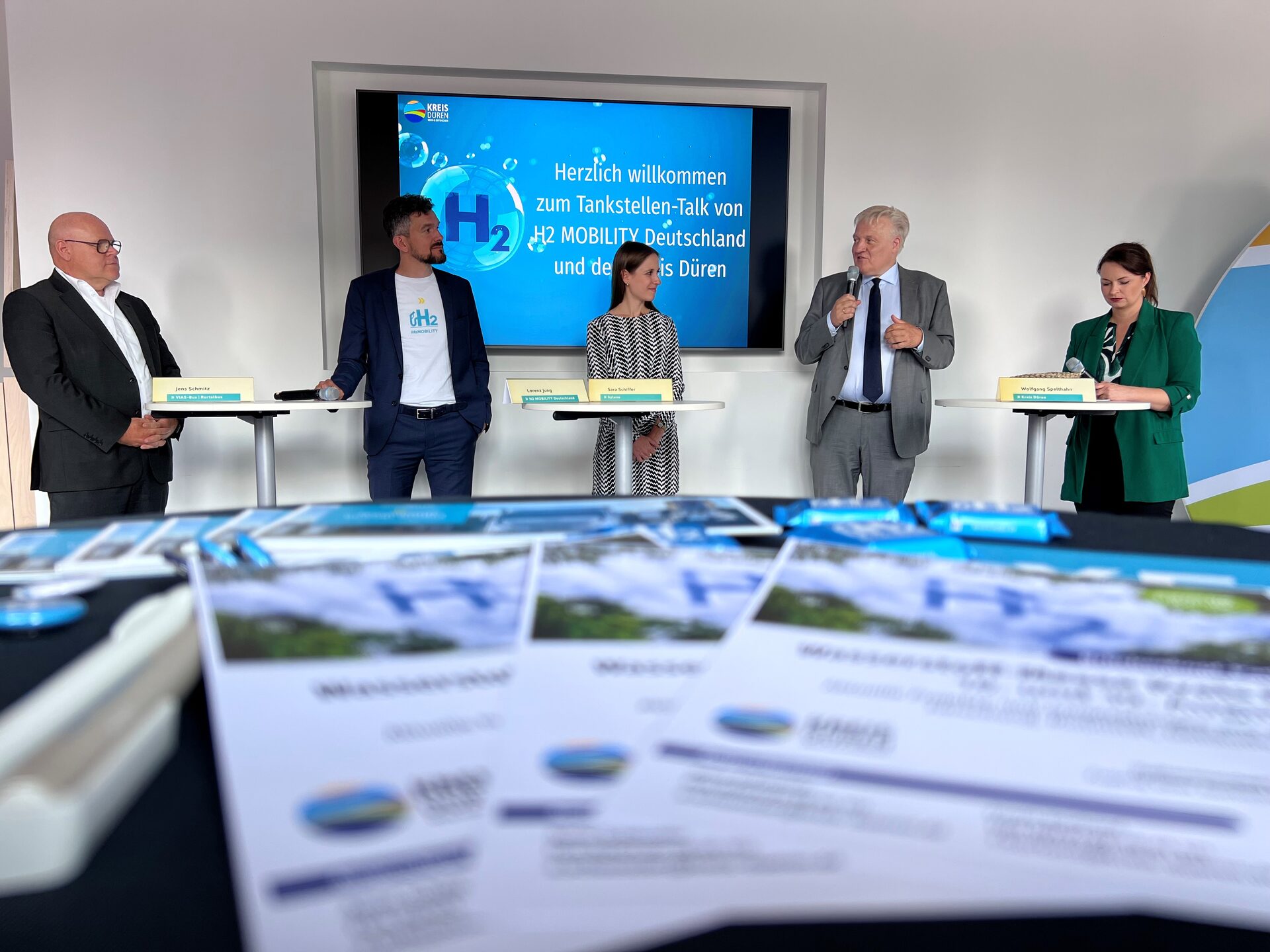 Der Bau der Wasserstofftankstelle wurde im Rahmen des Nationalen Innovationsprogramms Wasserstoff- und Brennstoffzellentechnologie mit insgesamt 1,37 Millionen Euro durch das Bundesministerium für Digitales und Verkehr gefördert. Die Förderrichtlinie wird von der NOW GmbH koordiniert und durch den Projektträger Jülich (PtJ) umgesetzt. Die Eröffnung wurde begleitet vom H2 MOBILITY Tankstellen-Talk im Forum Seen&Entdecken im Bismarck-Quartier Düren. Moderiert von Johanna Tissot tauschten sich vor geladenen Gästen Wolfgang Spelthahn, Landrat Kreis Düren, Lorenz Jung, H2 MOBILITY, Sara Schiffer, HyLane und Jens Schmitz, VIAS-Bus/Rurtalbus u.a. zu bisherigen Erfahrungen zum Tanken von Wasserstoff sowie über die Wasserstoff-Pläne des Kreises Düren aus. Der H2 MOBILITY Tankstellen-Talk fand im Rahmen der deutschlandweiten Woche des Wasserstoffs statt.