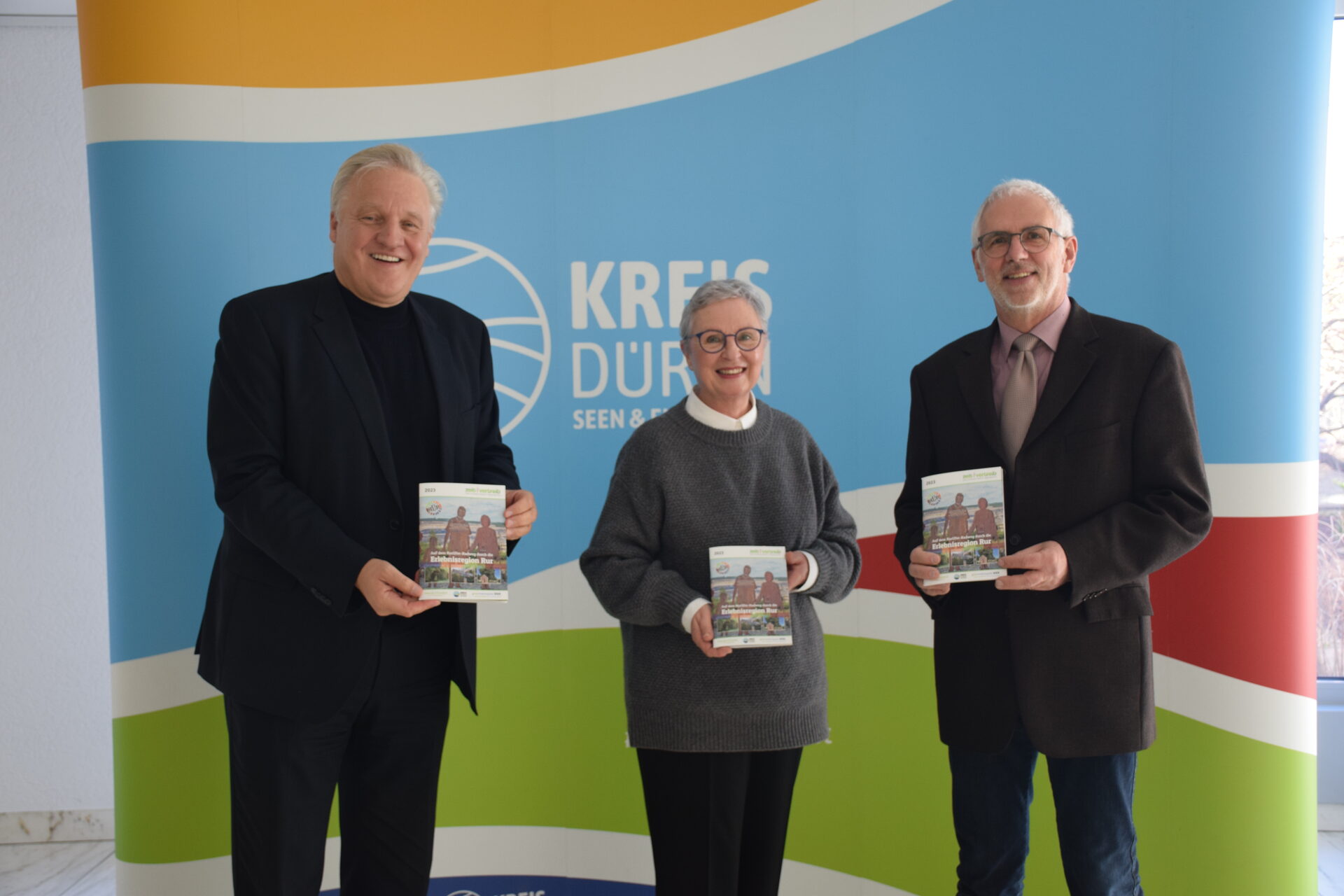 Marlene und Norbert Dreßen, die die Broschüre erstellt haben, präsentierten Landrat Wolfgang Spelthahn die neueste Auflage des kostenlos erhältlichen Freizeitführers. Auch in diesem Jahr rückt die 65-seitige Broschüre den RurUfer-Radweg in den Mittelpunkt.