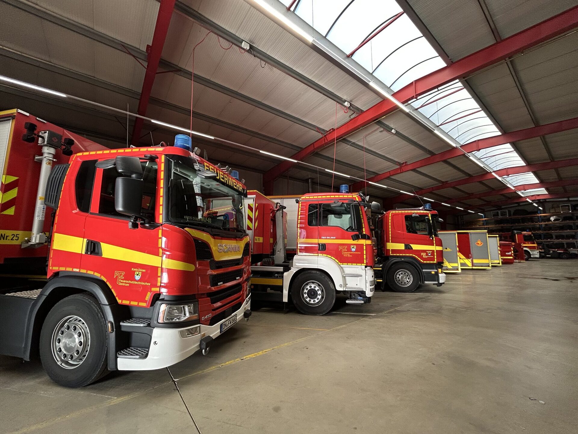 Die Abrollbehälter sind ein zentraler Bestandteil des Brand- und Katastrophenschutzes im Kreisgebiet. Im FTZ in Stockheim werden zahlreiche Sonderfahrzeuge, Geräte und Materialien vorgehalten, die im Einsatzfall den Feuerwehren der Städte und Gemeinden zur Verfügung stehen. Die Feuerwehren vor Ort müssen (und können) somit nicht jedes Gerät, Fahrzeug oder Material eigens vorhalten. „Es ist flexibler und kostengünstiger“, sagt Lars Knust, Werkstattleiter am FTZ. „Der Kreis Düren ist mit diesem System und den Geräten einer der am besten aufgestellten Kreise in Nordrhein-Westfalen.“
