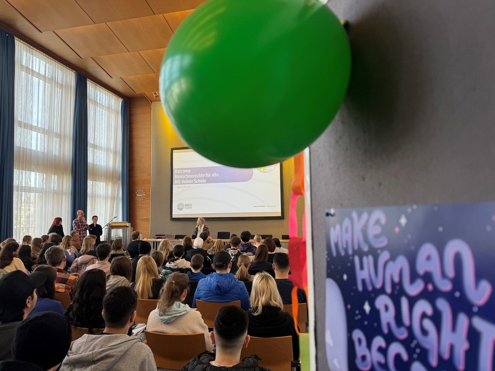 Ein Bar-Camp wird auch als "Unkonferenz" beschrieben und zeichnet sich durch offene Workshops aus, deren Inhalt und Ablauf von den Teilnehmenden selbst bestimmt und erarbeitet werden. Die Veranstaltung wurde vom Arbeitskreis Demokratie- und Menschenrechtsbildung Kreis Düren organisiert. Die Jugendlichen tauschten sich rund drei Stunden zu verschiedenen Themen aus und erarbeiteten Ideen, wie beispielsweise das Thema Menschenrechte in Schule verankert werden kann und welche Unterstützung sie sich hierfür wünschen. Im Vordergrund stand auch, dass sich die Schülerinnen und Schüler untereinander vernetzen. Umso erfreulicher war es, dass viele verschiedene Schulformen wie Förder-, Real- und Gesamtschulen sowie Berufskollegs und Gymnasien vertreten waren. Der Jugendliche Lukas Pazzini, der bereits an Bar-Camps des Kreises Düren teilgenommen hat, betonte zuvor in einem kurzen Vortrag die Wichtigkeit des Rechts auf Bildung und welche Rolle die Schule dabei spielen sollte. "Schule ist mehr als Unterricht, sie ist ein Bildungsraum, den wir mitgestalten können."